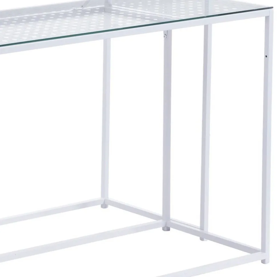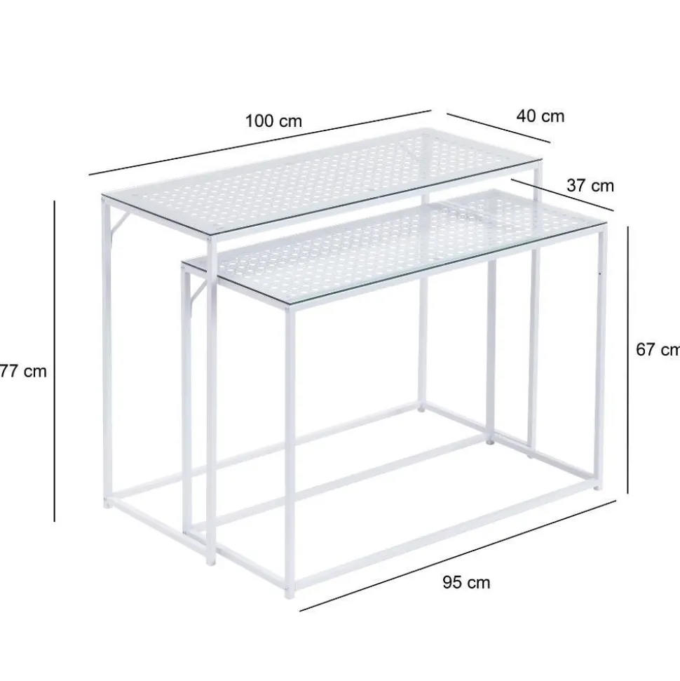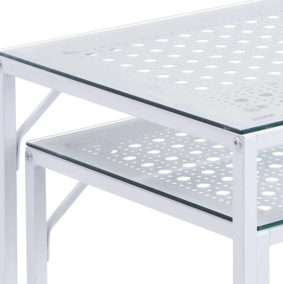 Gefertigt aus robustem Metall und hochwertigem Sicherheitsglas, vereint das Duo „Marian“ Stabilität mit einer edlen, transparenten Optik. Die weiß pulverbeschichteten Metallflächen sind pflegeleicht und widerstandsfähig – perfekt für den täglichen Gebrauch. Unter den Glasplatten setzen dekorativ gelochte Metallplatten stilvolle Akzente. Kleine runde und größere sechseckige Öffnungen bilden ein spannendes Muster, das den klaren Linien der Tische eine interessante, fast grafische Tiefe verleiht.