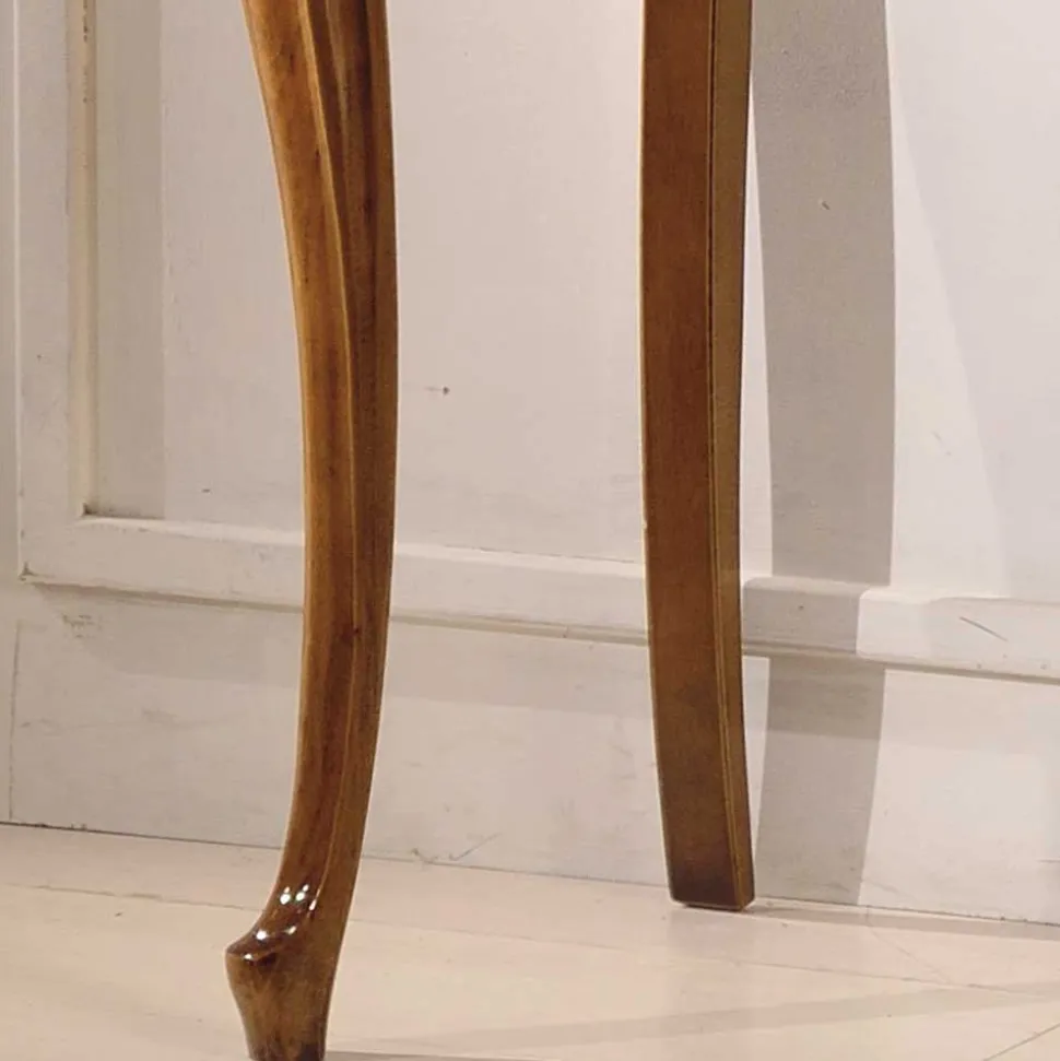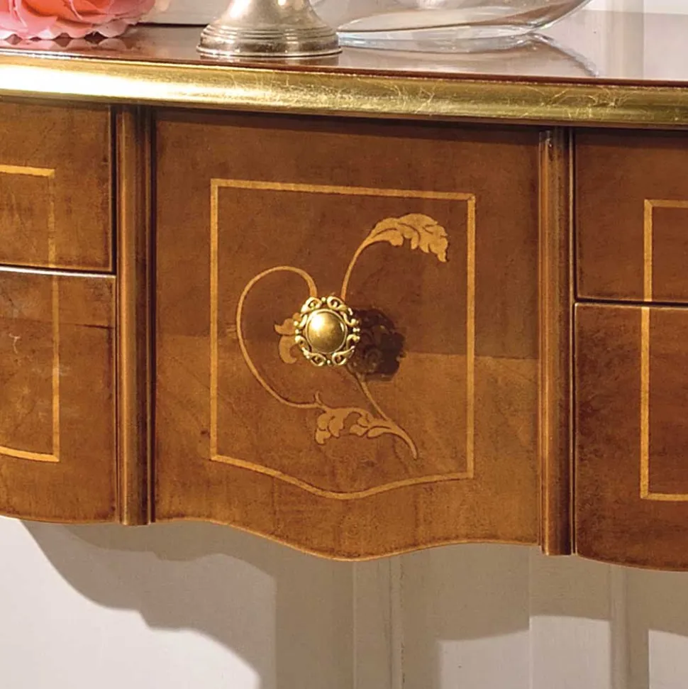 Der Konsolentisch Carlenna wird aus Massivholz und Holzwerkstoffen gefertigt. So kommt bei den Schubladen mit den herrlich schwungvoll gestalteten Fronten sowie bei den handgearbeiteten Intarsien mit floralem Charakter Pappelholz zum Einsatz. Die apart gestalteten Tischbeine mit den herrlichen Acanthus Schnitzereien bestehen hingegen aus massivem Tulpenbaum. Die Deckplatte ist aus MDF, Seitenteile sowie die Rückwand besteht aus robustem Schichtholz (mehrfach verleimte Tanne). Die harmonische Gesamtoptik des Möbelstücks ergibt sich aus einer hochwertigen Furnierung mit Nussbaum. Die Holzoberflächen sind zudem lackiert. Einzelne Dekorelemente und Kanten des Konsolentisches sind zudem in Gold hervorgehoben. Ansprechend gestaltete Knopfgriffe aus Metall runden das Erscheinungsbild des Möbels perfekt ab.