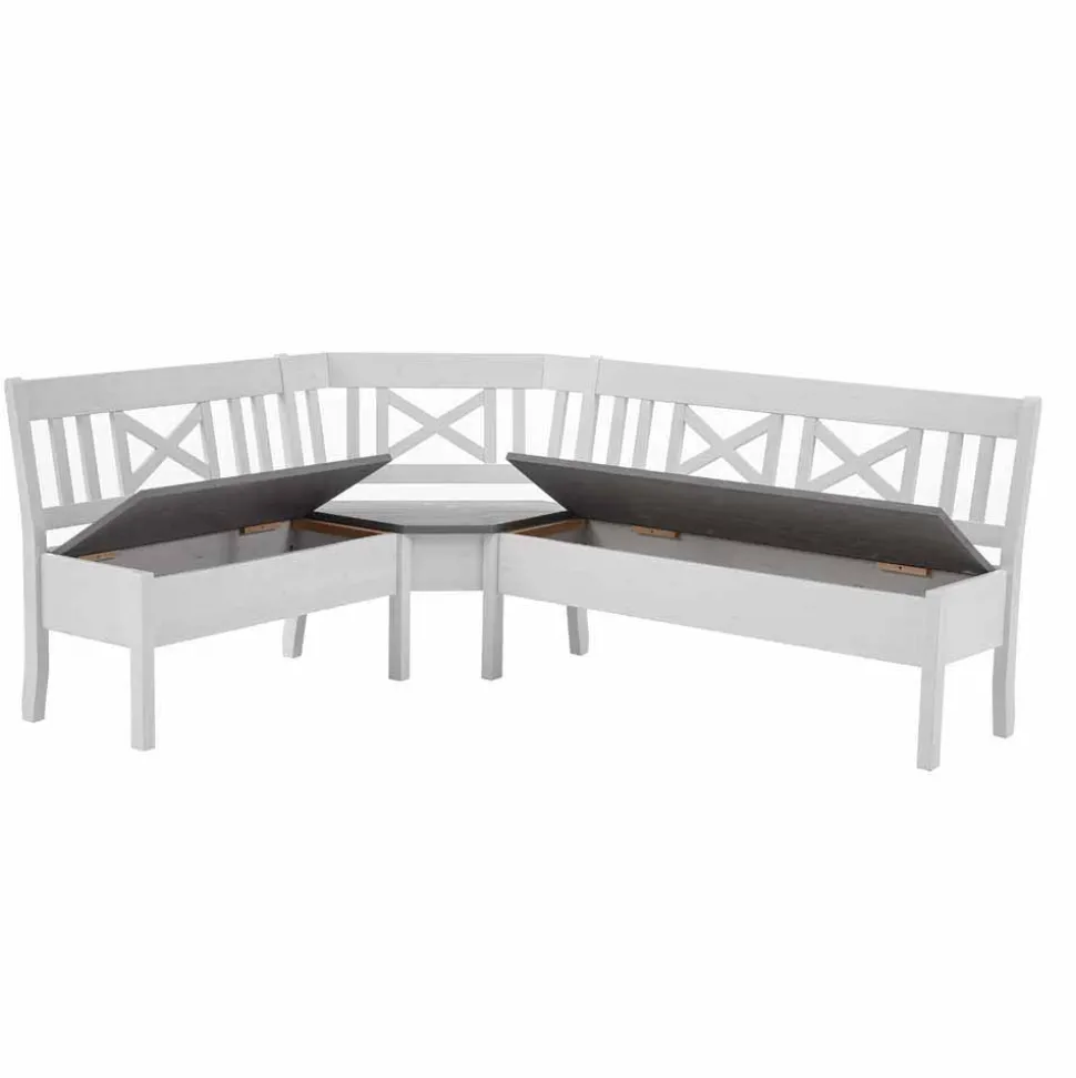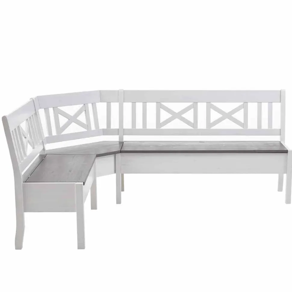 Die elegante Farbkombination aus weiß lackierten Flächen und einer grau gebeizten Sitzfläche mit durchscheinender Maserung sorgt für ein harmonisches und stilvolles Gesamtbild. Die dezente Farbgestaltung unterstreicht den Landhausstil und macht die Eckbank zu einem echten Blickfang in jedem Raum. Zudem trägt die Lackierung dazu bei, das Holz zu schützen und dessen natürliche Schönheit dauerhaft zu bewahren.