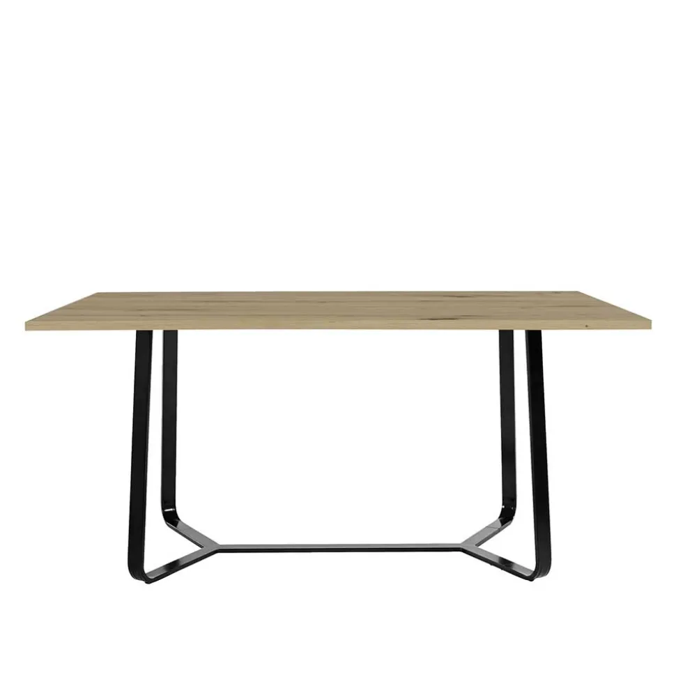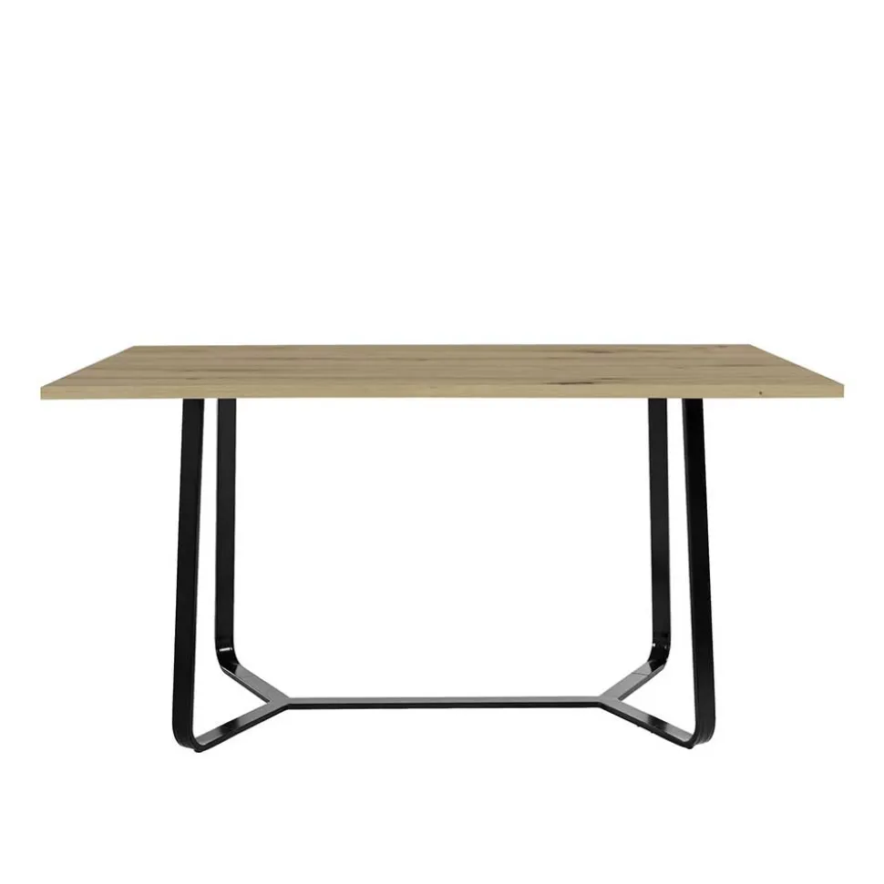 Der Küchentisch „Ofarello“ besteht aus hochwertiger Spanplatte und robustem Metall. Die rechteckige Form fügt sich harmonisch in jeden Raum ein. Die Tischplatte, mit einer Stärke von ca. 2,5 cm, ist stabil und in einer ansprechenden Holzoptik melaminbeschichtet. Das innovative Bügelgestell aus schwarz pulverbeschichtetem Metall verleiht dem Tisch eine moderne Note.