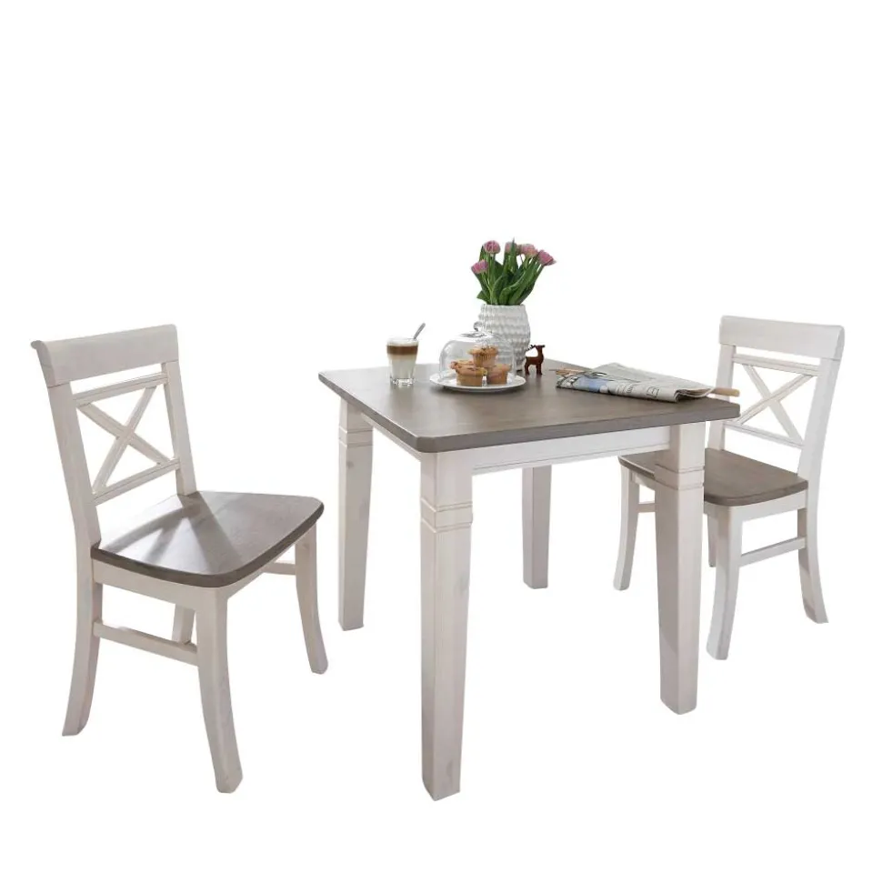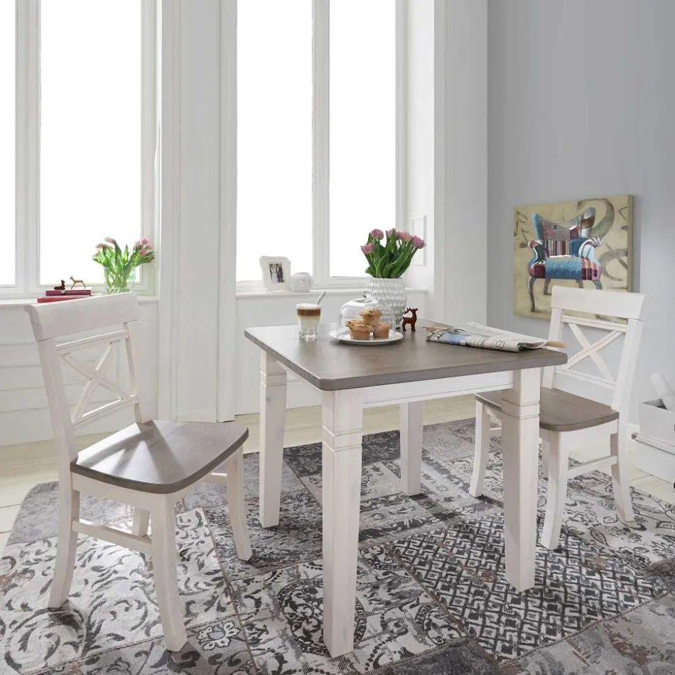 Die Sitzflächen der Stühle sowie die Tischplatte sind in einem eleganten Grauton gebeizt und lackiert, wodurch die natürliche Holzmaserung sanft durchschimmert. Die übrigen Oberflächen sind in klassischem Weiß gehalten und verleihen dem Möbelstück eine helle, freundliche Optik. Diese Farbgestaltung macht die Sitzgruppe vielseitig kombinierbar und lässt sich perfekt mit verschiedenen Einrichtungsstilen abstimmen.