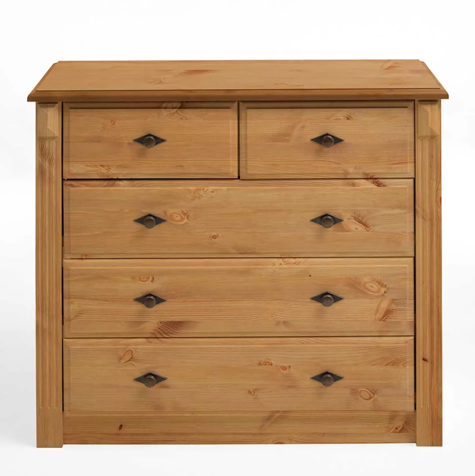 Mit einer Breite von 101 cm, einer Höhe von 87 cm und einer Tiefe von 48 cm bietet „Cabressan“ viel Stauraum. Die Kommode verfügt über zwei kleine und drei große Schubladen, die mit hochwertigen Metallauszügen ausgestattet sind. Diese sorgen für eine leichte und geräuscharme Bedienung. Die elegant gefräste Oberplatte und das reliefartige Design an der Frontseite verleihen der Kommode zusätzlichen Charme.