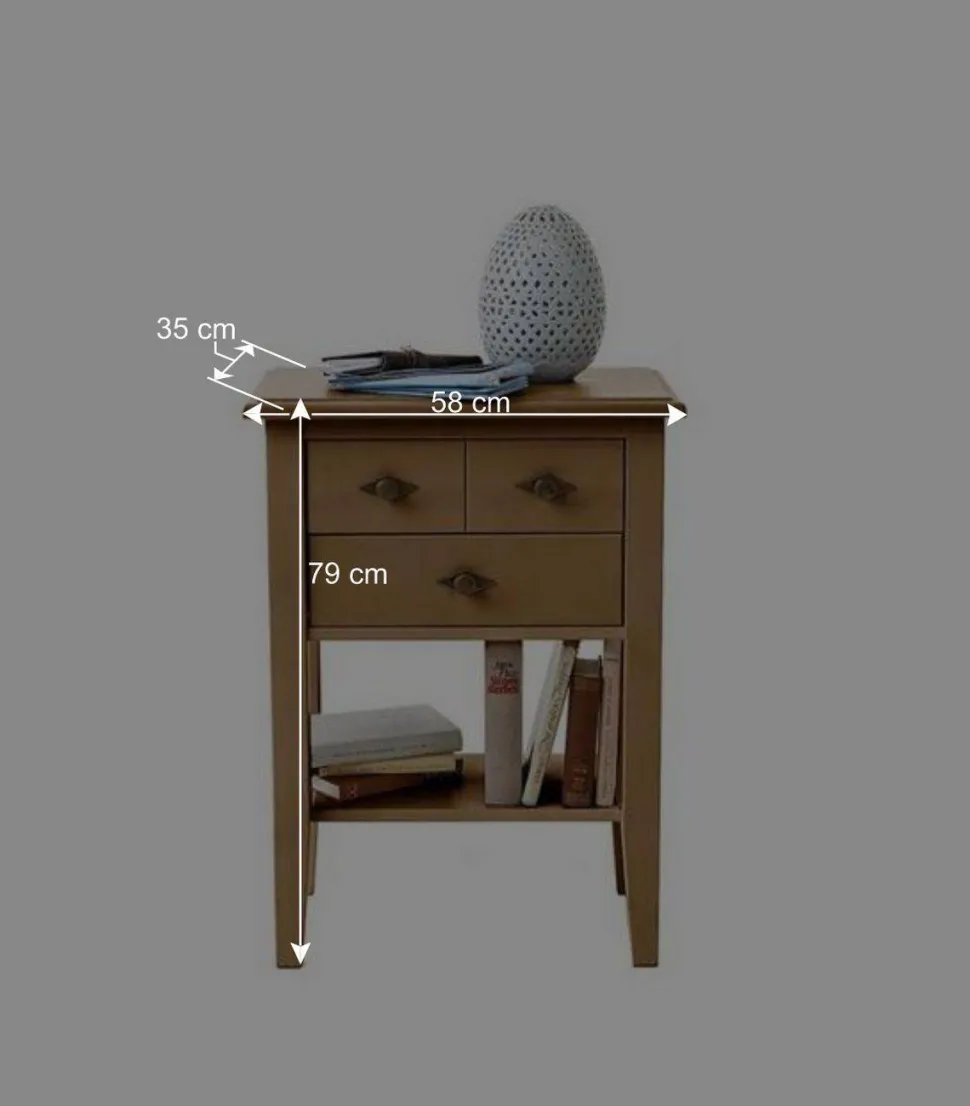 Mit den Maßen von 58 cm Breite, 79 cm Höhe und 35 cm Tiefe bietet die Kommode genügend Stauraummöglichkeiten, ohne dabei zu viel Platz in Anspruch zu nehmen. Zwei Schubkästen auf Metallauszug, wobei die obere Schublade in einer Zwei-Schubladenoptik gestaltet ist, sorgen für Ordnung und Übersichtlichkeit. Die zusätzliche Ablage unten bietet weiteren Platz für Dekorationsartikel oder Alltagsgegenstände.