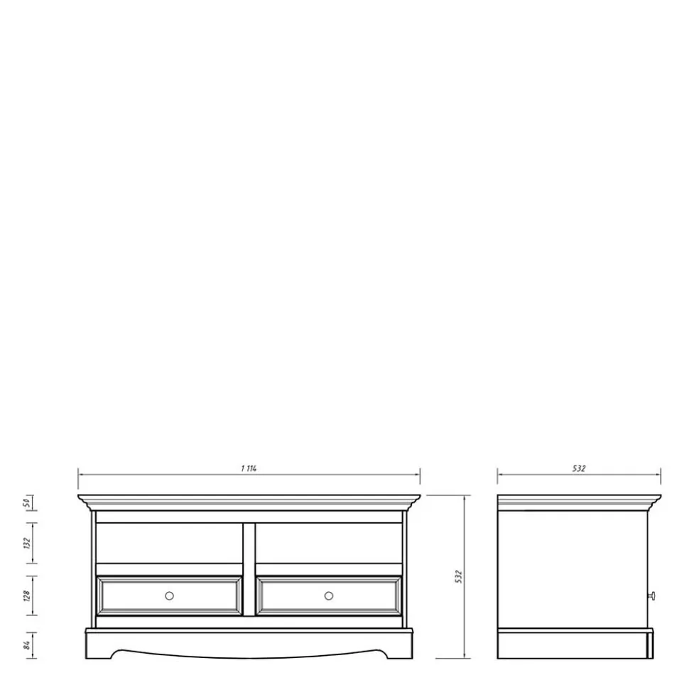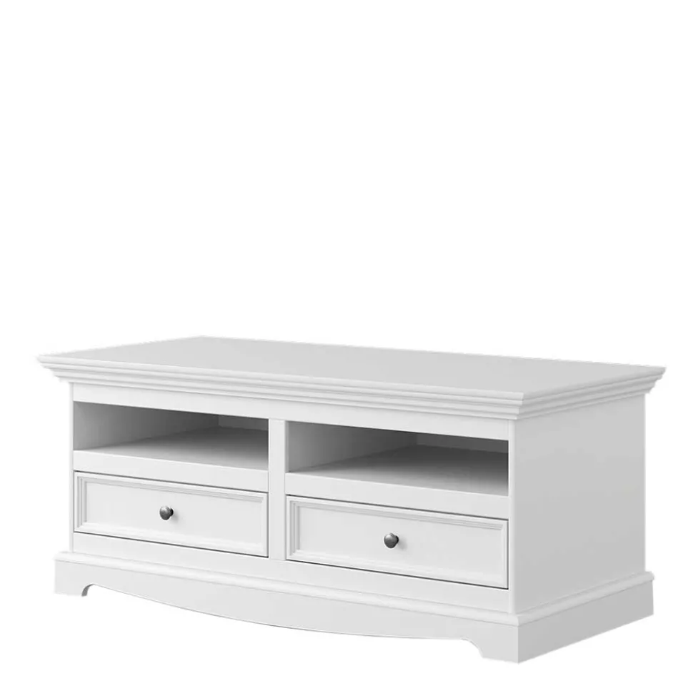 Mit Maßen von 111 cm Breite, 53 cm Höhe und 53 cm Tiefe bietet dieses Lowboard übersichtlichen Stauraum. Zwei offene Gerätefächer und zwei Schubladen mit Metallauszug und Soft Close Funktion – für ein sanftes und leises Schließen – bieten praktischen Stauraum. Die runden Metall-Knopfgriffe in Altsilberfarben fügen sich harmonisch in das Gesamtbild ein.