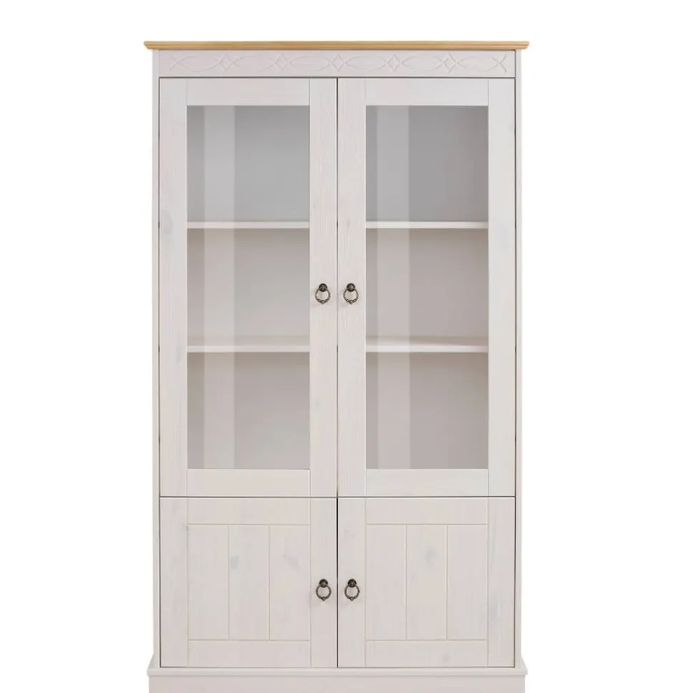 Mit einer Breite von 85 cm, einer Höhe von 145 cm und einer Tiefe von 32 cm bietet die Vitrine Zentra großzügigen Stauraum auf charmante Weise. Hinter vier stilvollen Drehtüren, von denen die oberen mit großen Glaseinsätzen versehen sind, präsentieren sich drei Einlegeböden und ein stabiler Konstruktionsboden – perfekt für Geschirr, Bücher, Dekoobjekte oder Ihre schönsten Erinnerungsstücke. Der geschlossene Sockel sorgt für optische Bodenhaftung, während die überstehende Deckplatte in honigfarbener Lackierung einen warmen Kontrast zum weißen Korpus setzt.