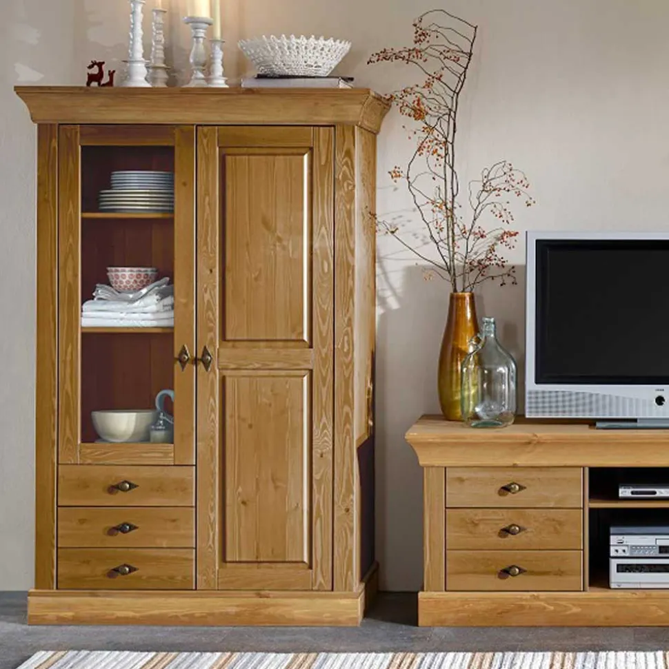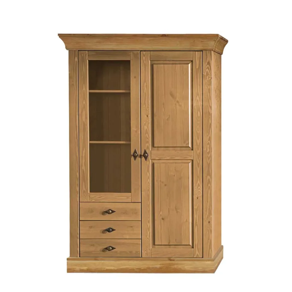 Unser Vitrinenschrank besteht aus dem robusten Kiefernholz, welches nicht nur durch seine Langlebigkeit und Stabilität beeindruckt, sondern auch durch seine charakteristische Maserung, die jedem Möbelstück seine individuelle Note verleiht. Die Seiten und Böden der Schubladen sowie die Möbelrückwand sind aus strapazierfähigem Sperrholz gefertigt, das sich durch seine hohe Belastbarkeit und Formstabilität auszeichnet.