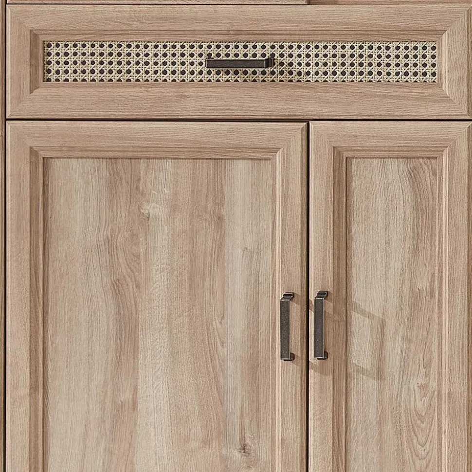 Besonders auffallend ist die Kassettenoptik der Fronten in warmen Naturtönen. Die Schubkästen bieten Wendefüllungen, die Ihnen die Wahl zwischen Wiener Geflecht Optik und Eiche Holzoptik lassen. Bügelgriffe aus Metall in Altsilberfarben verleihen der Front zusätzlich eine elegante Note und setzen edle Akzente.