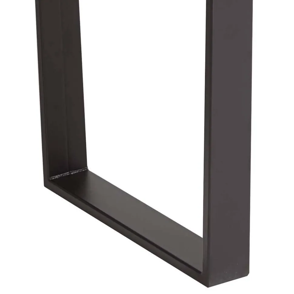 - Holzoberfläche geölt, Gestell in Schwarz pulverbeschichtet, die Astlöcher werden mit schwarzem Shellack ausgekittet