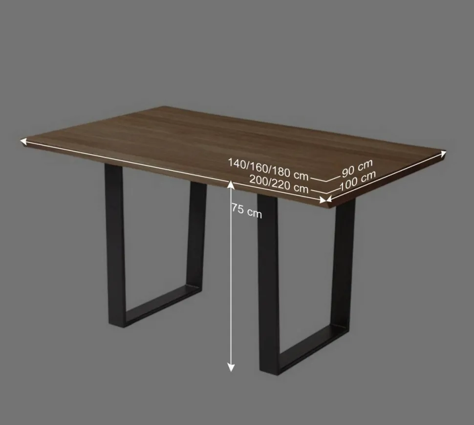 Mit einer Höhe von 75 cm und einer Breite, die je nach Ihrer Wahl zwischen 140 cm und 220 cm variiert, bietet „Sympatia“ genügend Platz für gemütliche Familienessen oder stilvolle Dinnerpartys. Die massive Tischplatte ohne Mittelfuge und die attraktive Baumkante verstärken den Eindruck, dass dieses Stück direkt aus der Natur in Ihr Zuhause transportiert wurde. Das robuste u-förmige Metallbügelgestell in Schwarz setzt einen markanten Kontrast zur natürlichen Tischplatte und unterstreicht den industriellen Charme des Möbelstücks.