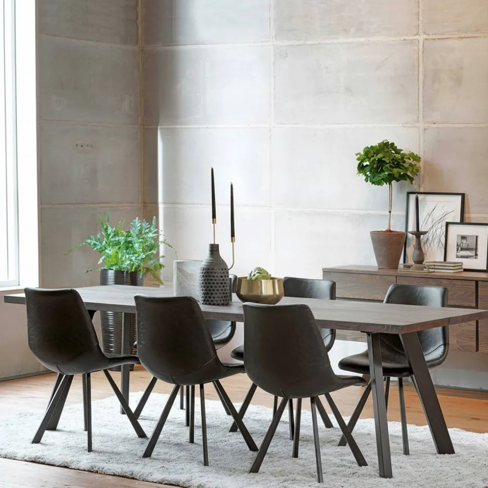 Der Esstisch „Namac“ vereint den markanten Industry- und Loft-Stil zu einem unverwechselbaren Designstück. Gefertigt aus massiver Eiche und Stahl, bringt dieser Tisch nicht nur optisch Wärme in Ihren Raum, sondern sorgt auch für ein gesundes Raumklima. Eichenholz zeichnet sich durch seine Langlebigkeit und Robustheit aus, was diesem Möbelstück eine besonders lange Lebensdauer verleiht. Die gebürstete Tischplatte, dunkelbraun gebeizt und lackiert, besticht durch eine lebhafte Maserung, die den natürlichen Charakter des Holzes hervorhebt. Die Lackierung schützt das Holz zusätzlich und sorgt für eine pflegeleichte Oberfläche, die Ihnen lange Freude bereiten wird.
