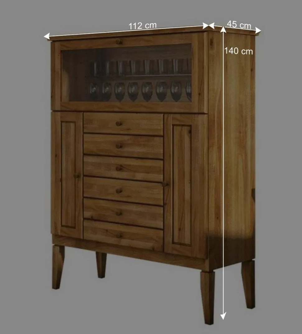 Die Stärke der Deckplatte von 2,5 cm sowie Front und Seiten von 2 cm unterstreichen die solide Bauweise. Mit einer Breite von 112 cm, einer Höhe von 140 cm und einer Tiefe von 45 cm bietet das Highboard ausreichend Stauraum für Ihre Habseligkeiten. Die Deckplatte ziert eine profilierter Kante, die das harmonische Design abrundet.