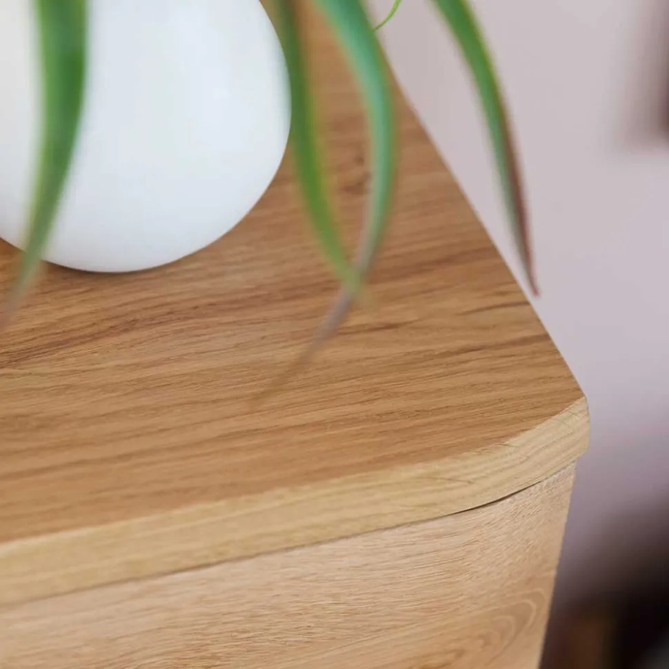 - Aus Eiche Massivholz (Front) und Spanplatte (Korpus) gefertigt
