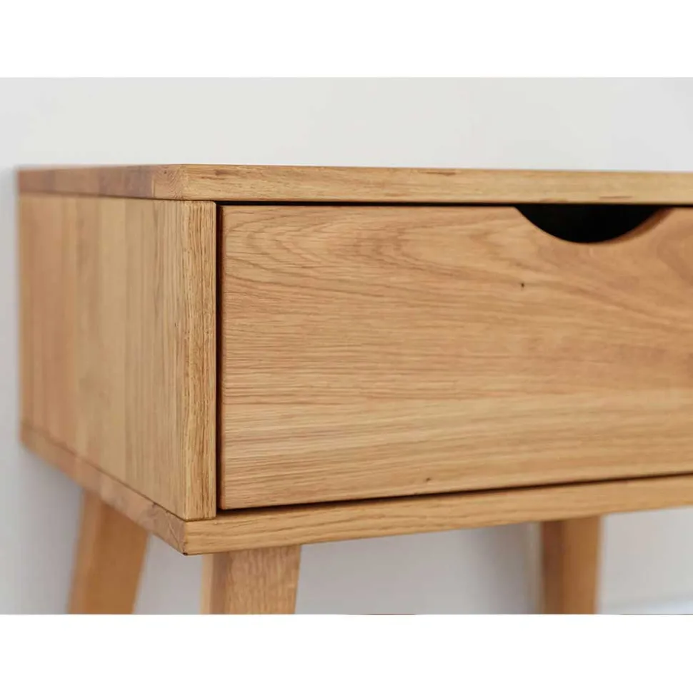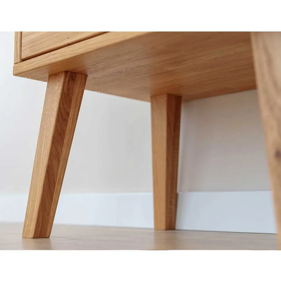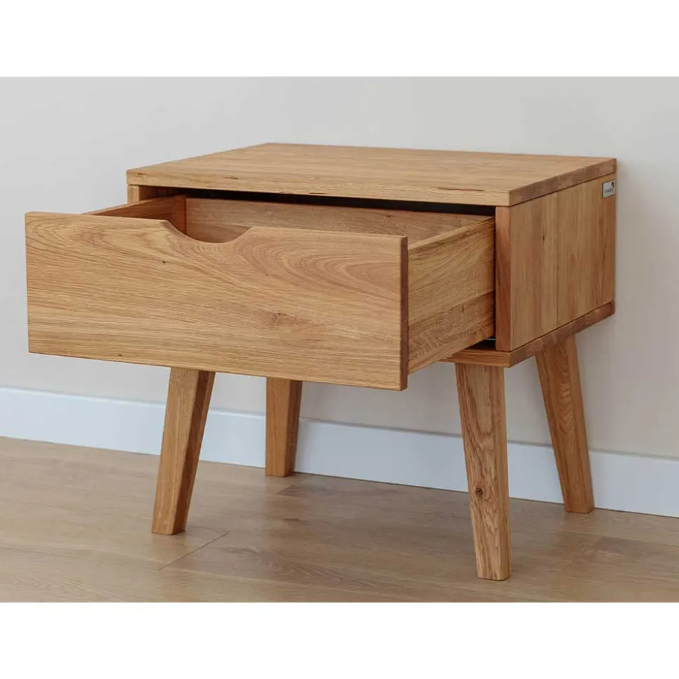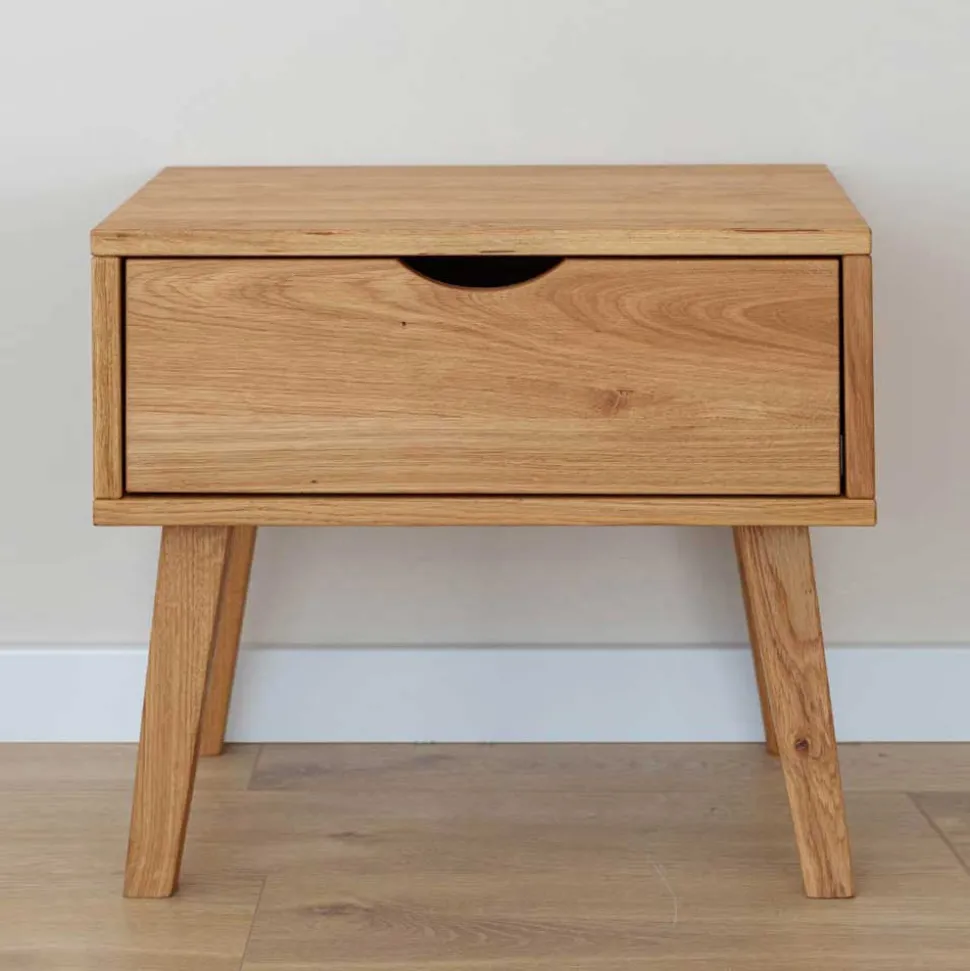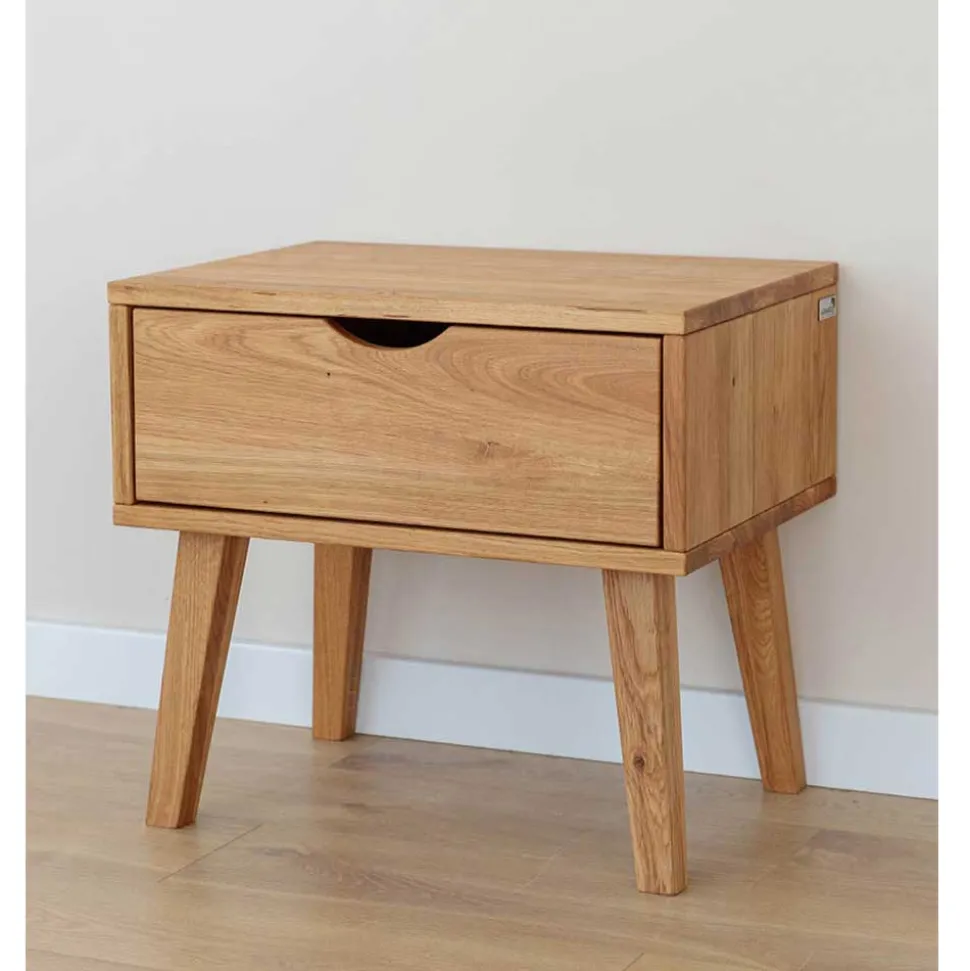Die Nachtkommode „Fabijola“ steht nicht nur für ansprechendes Design, sondern auch für erstklassige Verarbeitung und Langlebigkeit. Das Wildeiche Massivholz, aus dem die Kommode gefertigt ist, zeichnet sich durch seine hohe Stabilität und Beständigkeit aus. Die vier stabilen Holzbeine sind schräg nach außen verlaufend und nach unten hin verjüngt, was dem Möbelstück nicht nur einen sicheren Stand, sondern auch eine leichte Optik verleiht. Die Oberflächen des Holzes sind zum Schutz natürlich geölt, wodurch die Nachtkommode lange ihre Schönheit behält.
