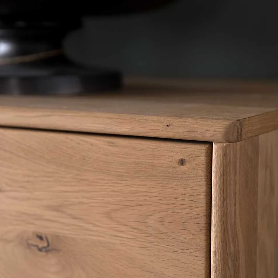 - Hergestellt aus Asteiche Massivholz (Front), MDF (Absetzungen), Spanplatte (Korpus) und Glas