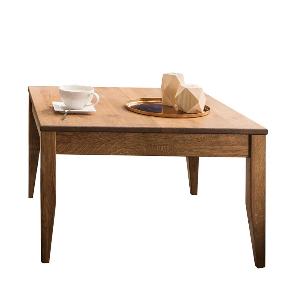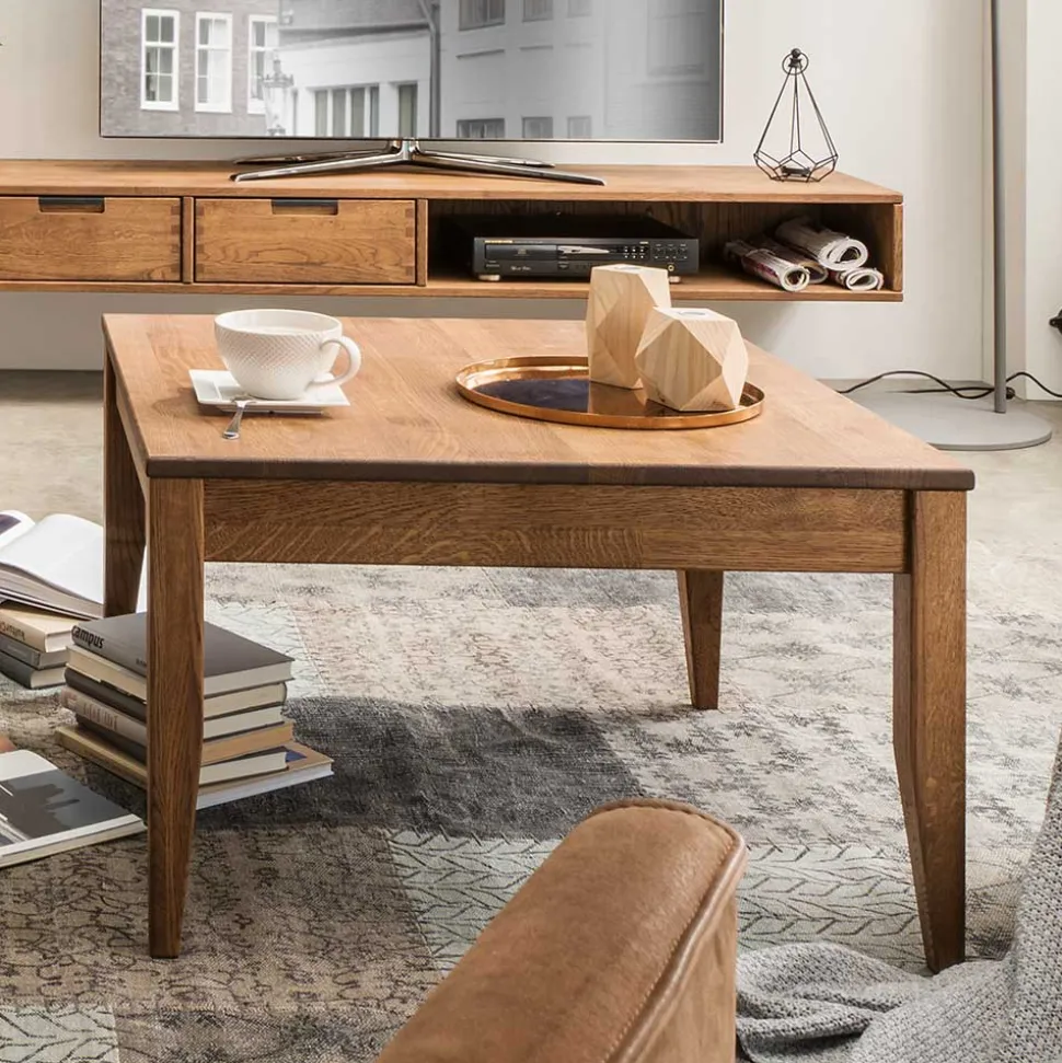 Mit seiner perfekten Höhe von 49 cm und der Wahl zwischen einer quadratischen (75 cm breit) und einer rechteckigen (115 cm breit) Form passt sich der Couchtisch „Glenza“ nahtlos in jede Wohnzimmereinrichtung ein. Die massive Tischplatte mit ihrer individuellen Holzmaserung und sorgfältigen Kantenverarbeitung betont die Qualität und Verarbeitung des Möbelstücks.