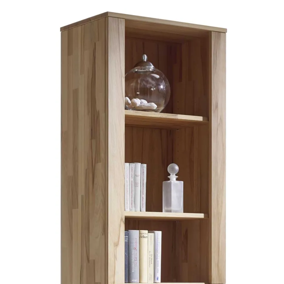 Das Massivholzregal Wahano besteht aus lebhaft gemaserter Kernbuche mit natürlich geölten Oberflächen. Während alle anderen Flächen des Möbelstücks glatt ausgeführt sind, ist die Schubladenfront geschroppt ausgeführt, wodurch die Erscheinung des Regals markant-interessanter wird.