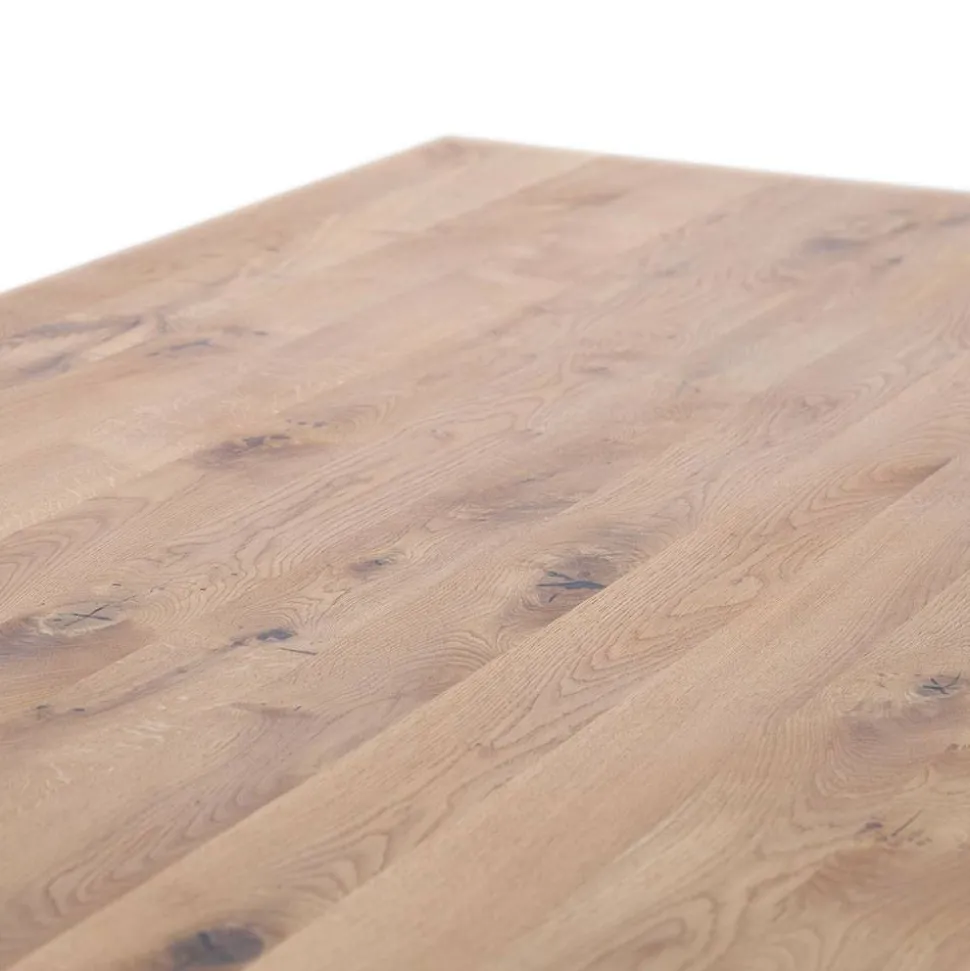 Gefertigt aus massivem Balkeneichenholz und robustem Stahl, punktet der Tisch mit hoher Stabilität und Langlebigkeit. Die natürlich geölte Oberfläche betont die schöne Maserung des Holzes, während das abgewinkelte Gestell aus Vierkantrohr (5×5 cm) dem Tisch einen industriellen Look verleiht. Die Tischplatte mit durchgehender Lamellenverarbeitung und 2,5 cm starker Grundplatte ist am Rand auf 5 cm aufgedoppelt – ein Qualitätsmerkmal, das man sieht und spürt.