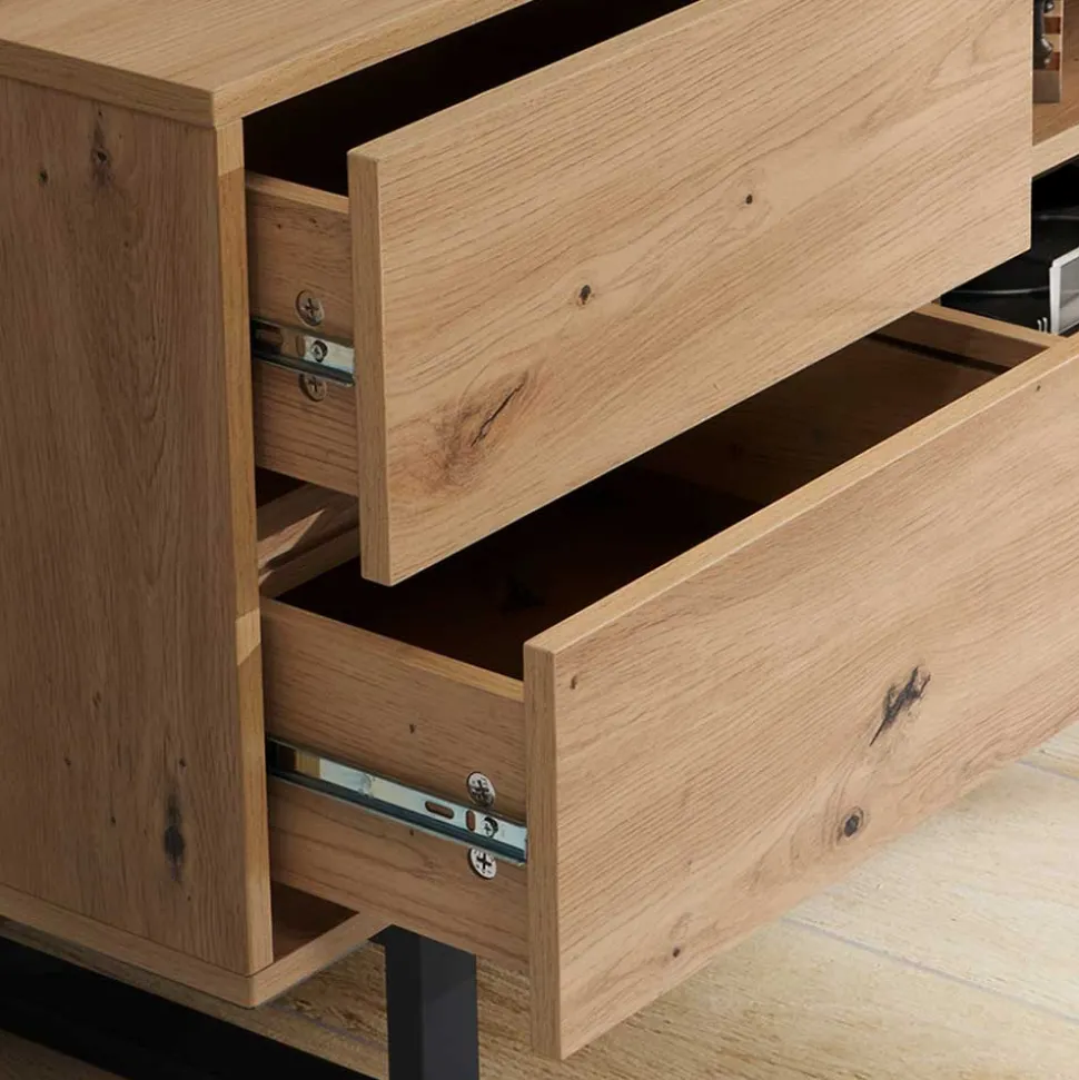 Das Lowboard „Priazena“ bietet durch seine durchdachte Aufteilung viel Stauraum für all Ihre Multimedia-Geräte und Zubehör. Zwei geräumige Schubladen mit leichtgängigen Metallauszügen (Innenmaße: ca. 42x17x35 cm) und zwei offene Gerätefächer (Innenmaße: ca. 47×17,5×38 cm) sorgen für eine übersichtliche Anordnung Ihrer Unterhaltungselektronik. Ein cleverer Kabeldurchlass in der Rückwand ermöglicht eine ordentliche Kabelführung. Drei weitere offene Fächer bieten optimalen Platz für Schallplatten, Zeitschriften, Magazine oder Bücher.