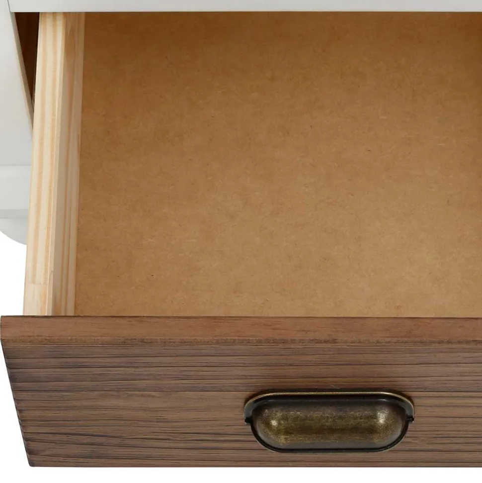 Die Nachtkommode bietet mit zwei geräumigen Schubladen ausreichend Platz für Ihre Utensilien. Die Schubladenfronten in warmem Kiefernholz Braun setzen einen schönen Kontrast zum weißen Korpus und verleihen der Kommode ihren einzigartigen Charme. Dank der Metallauszüge gleiten die Schubladen sanft und zuverlässig, während die Muschelgriffe aus Altmessing einen zusätzlichen Hauch von Nostalgie hinzufügen.