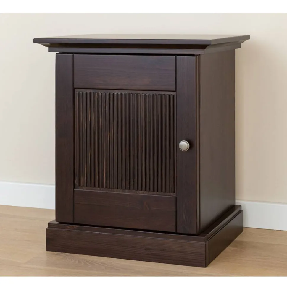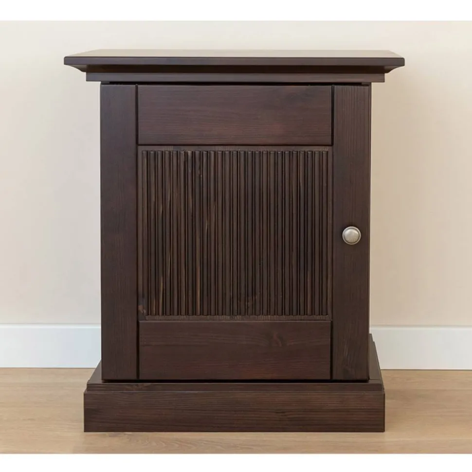 Ein besonderes Highlight ist die formschöne, leicht überstehende Deckplatte mit elegantem Profil. Die Front der Tür zeigt dekorative Rillenfräsungen, die dem Nachtschrank eine dezente Struktur verleihen. Die Tür ist mit hochwertigen Soft-Close-Beschlägen aus Metall ausgestattet und schließt dadurch angenehm leise. Der Innenraum wird durch einen verstellbaren Einlegeboden in zwei praktische Fächer unterteilt – perfekt, um persönliche Dinge ordentlich zu verstauen. Ein schlicht-charmanter Knopfgriff aus Metall in Altsilber setzt dabei einen harmonischen Akzent.