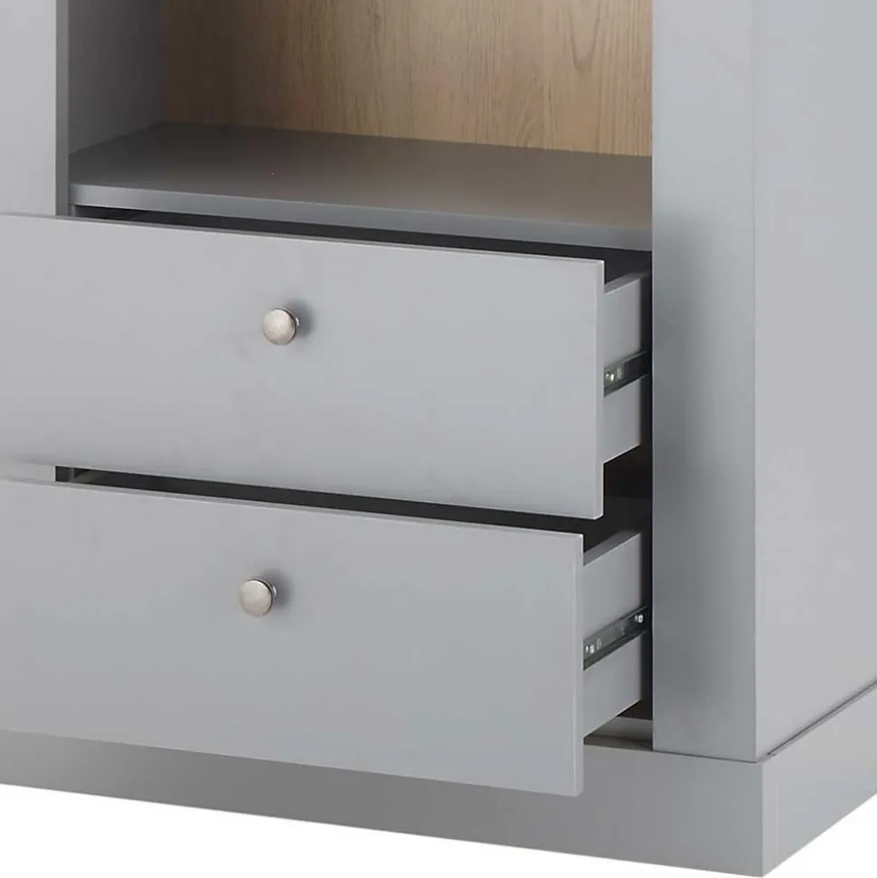 Jedes Detail unserer Wohnwand „Buleta“ wurde mit dem Gedanken an Komfort und Praktikabilität entworfen. Die Türen, wahlweise rechts oder links montierbar, sind mit hochwertigen Metallbeschlägen ausgestattet, die für eine reibungslose Handhabung sorgen. Dank der fest verbauten Einlegeböden bleibt alles an seinem Platz, während die praktischen Löcher zur Kabelführung im TV-Lowboard für eine ordentliche und aufgeräumte Optik sorgen. Zusätzlich garantieren die Schubladen mit Metallauszug und die modernen Metallknopfgriffe in Altsilber eine lange Lebensdauer und eine stilvolle Optik.