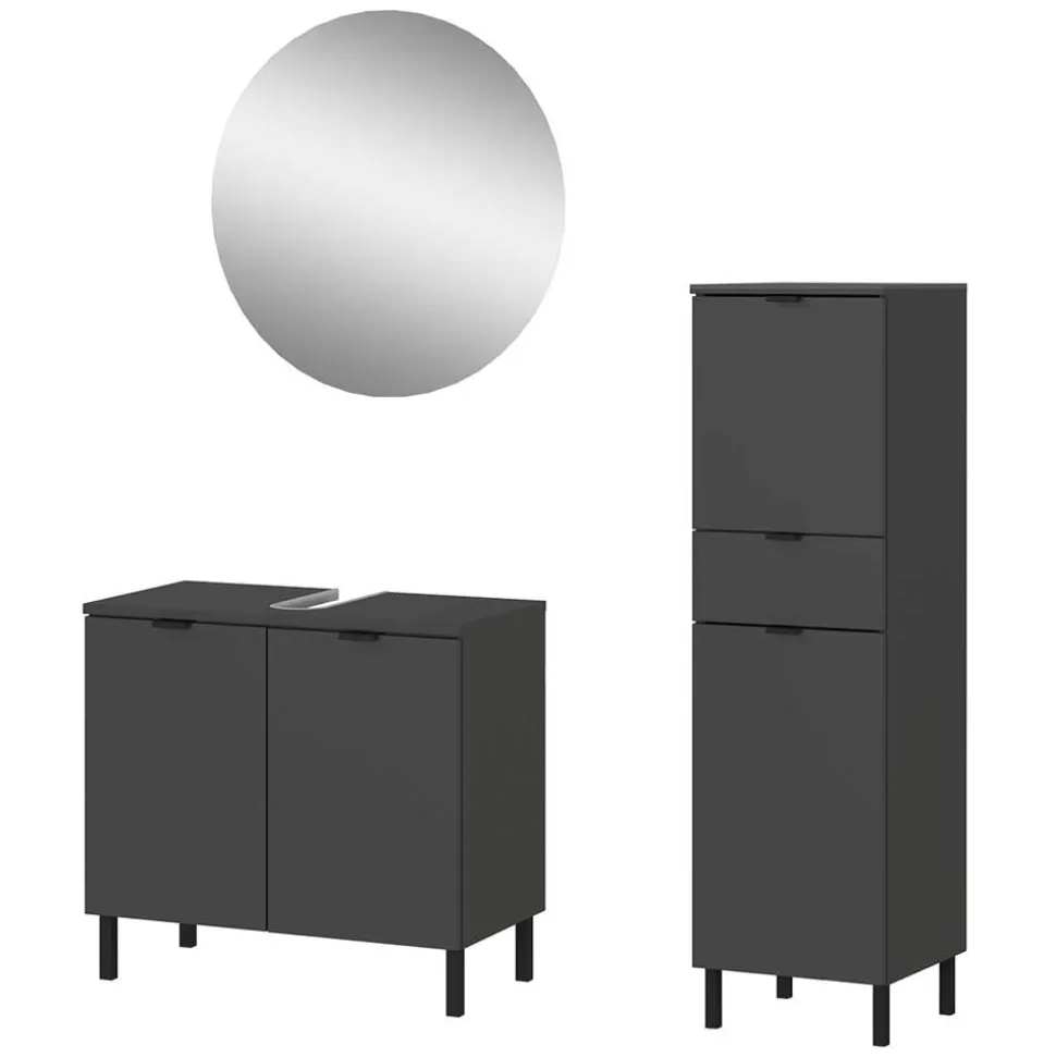 Tauchen Sie ein in zeitlose Eleganz mit der Badmöbel Kombi „Quado“, deren Design in elegantes Dunkelgrau getaucht ist. Dieses dreiteilige Set aus hochwertigem Holzwerkstoff und edlem Spiegelglas verleiht Ihrem Badezimmer nicht nur eine ästhetische Note, sondern überzeugt auch mit praktischen Merkmalen.