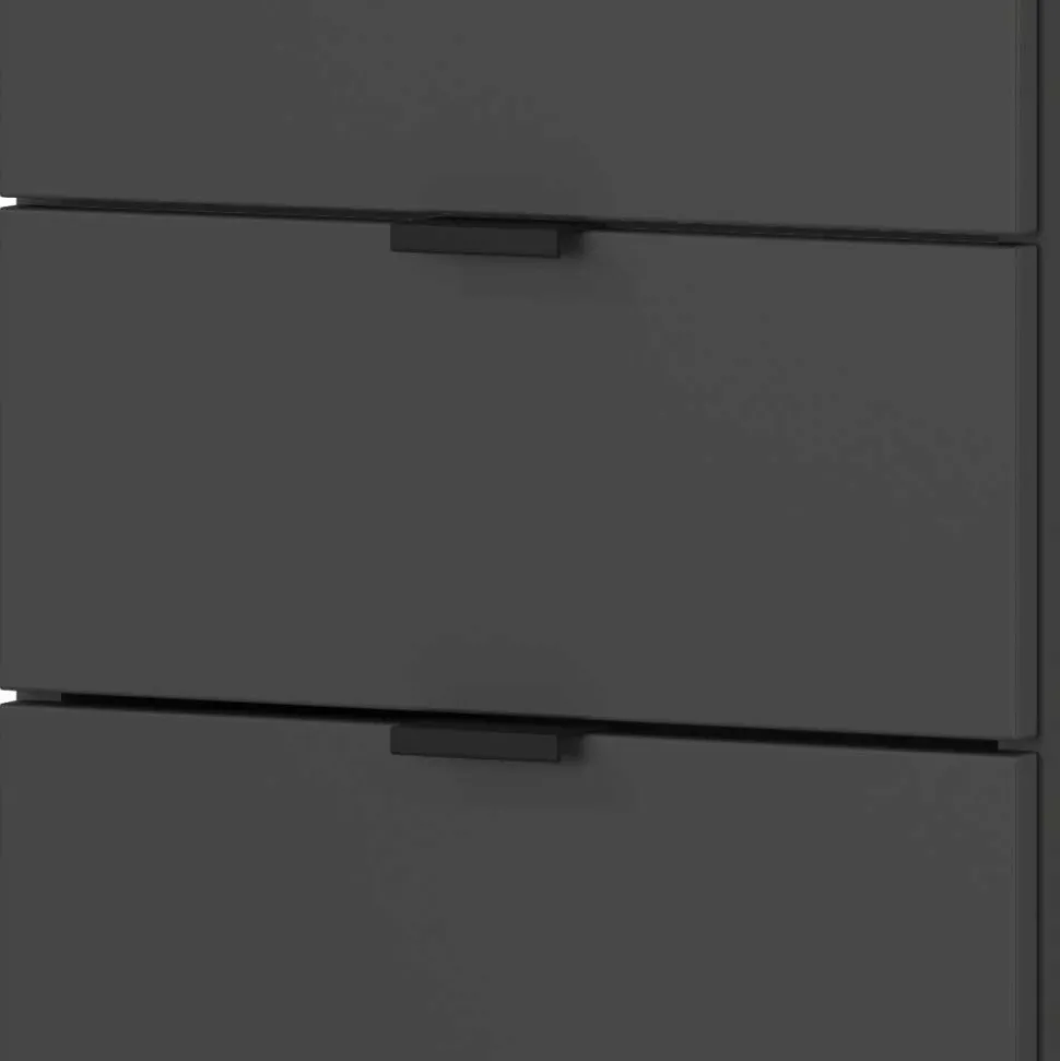Die melaminbeschichtete Oberfläche garantiert nicht nur eine einfache Reinigung, sondern auch Langlebigkeit im täglichen Gebrauch. Schwarze Kantengriffe aus Metall setzen Akzente und unterstreichen das moderne Erscheinungsbild dieses Möbelsets.