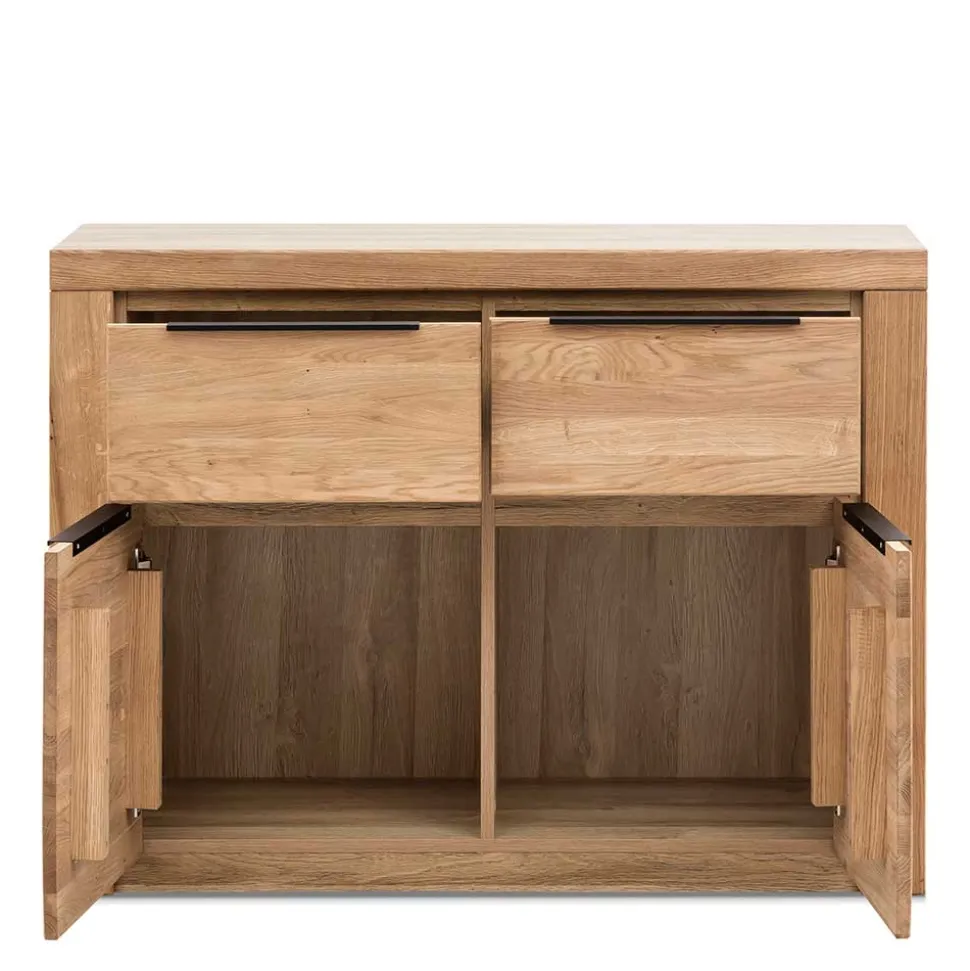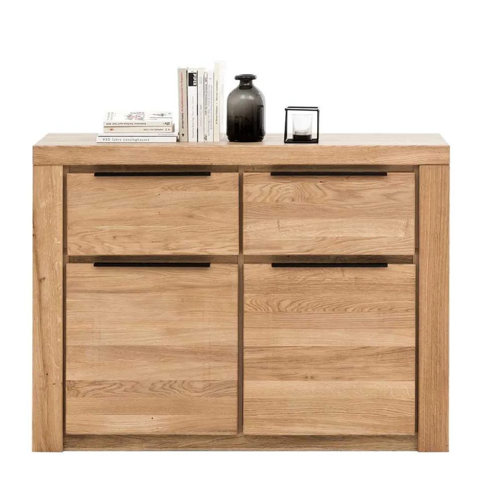 Die Fronten dieses Möbelstücks bestehen aus massivem Eichenholz, einem der robustesten und langlebigsten Holzarten. Eichenholz überzeugt nicht nur durch seine beeindruckende Strapazierfähigkeit, sondern auch durch seine individuelle Maserung, die jedem Möbelstück eine einzigartige Note verleiht. Die natürliche Geöltheit der Massivholz-Oberfläche schützt und betont gleichzeitig das charakteristische Erscheinungsbild des Holzes.