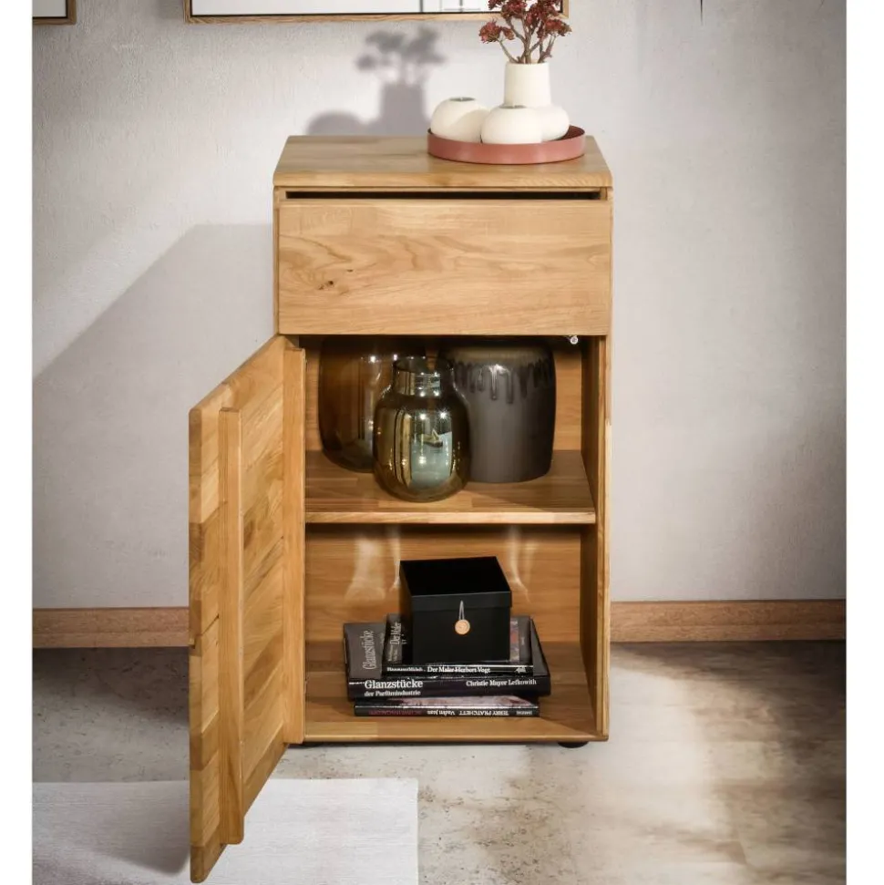 Die Wildeiche besticht durch ihre lebhafte Maserung und ihre außergewöhnliche Robustheit. Jedes Stück Holz erzählt seine eigene Geschichte, was jede Kommode Feanor zu einem Unikat macht. Die natürlich geölte Oberfläche betont nicht nur die Schönheit des Holzes, sondern schützt es gleichzeitig vor Feuchtigkeit und Verschleiß. Wildeiche ist bekannt für ihre Langlebigkeit und ihre positive Wirkung auf das Raumklima, da sie auf natürliche Weise die Luftfeuchtigkeit reguliert.
