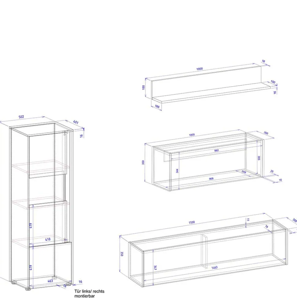 Die zurückgesetzten Griffblenden in Holzoptik sind nicht nur stilvolle Akzente, sondern dienen auch als praktische Griffe zum Öffnen der Vitrinentüren. Flache Kunststoffgleiter an den Vitrinen sorgen für Stabilität und schützen Ihren Boden. Die Möglichkeit zur Wandmontage der anderen Möbel spart Platz und schafft ein aufgeräumtes Erscheinungsbild.