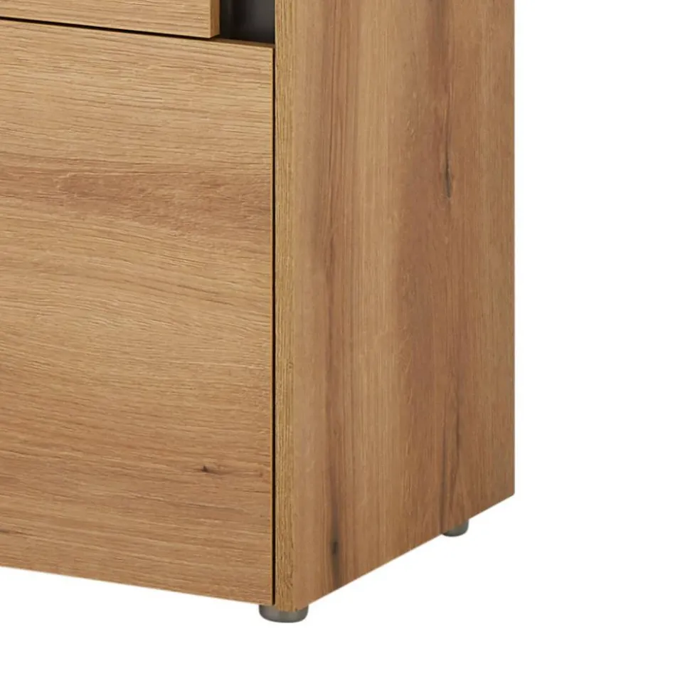 Material und Verarbeitung Gefertigt aus hochwertiger Spanplatte, sind alle drei Vitrinen mit pflegeleichten, melaminbeschichteten Oberflächen in Wildeiche Holzoptik und Anthrazit versehen. Die Möbel stehen stabil auf flachen Kunststoff-Bodengleitern und sollten zur Kippsicherung zusätzlich an der Wand befestigt werden. Die leicht zurückgesetzte Blende in Anthrazit neben der oberen Tür dient als dezente Griffmulde – die Fronten selbst sind bewusst grifflos und schlicht gehalten. Stabile Metallbeschläge sorgen für langlebige Funktionalität.