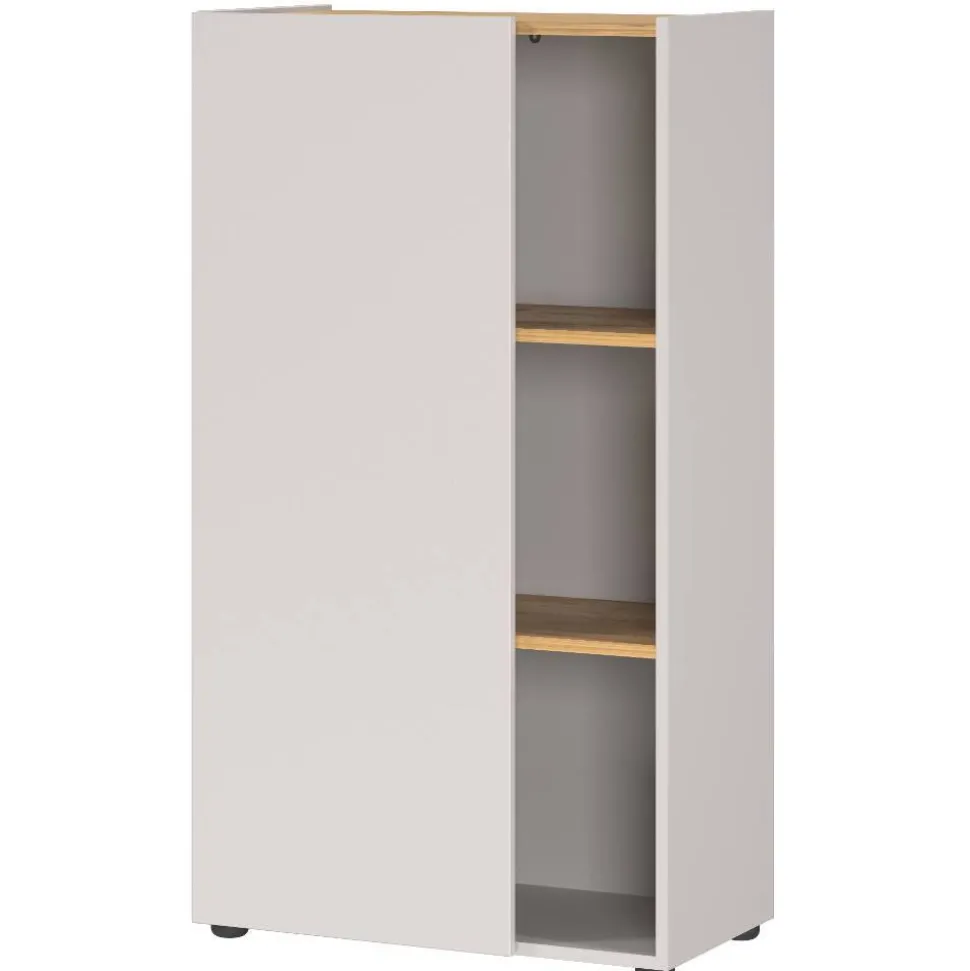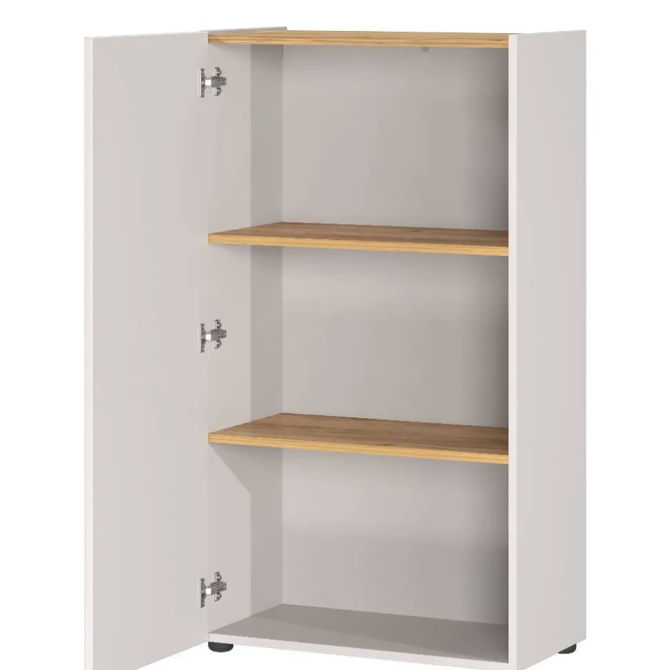 Der Ordnerschrank „Chiron“ bietet eine stilvolle und funktionale Lösung für die geordnete Aufbewahrung von Akten, Ordnern und Dokumenten. Seine moderne Kombination aus Hellgrau und Eiche-Holzoptik fügt sich harmonisch in Arbeitsräume ein und überzeugt mit seiner klaren Linienführung.