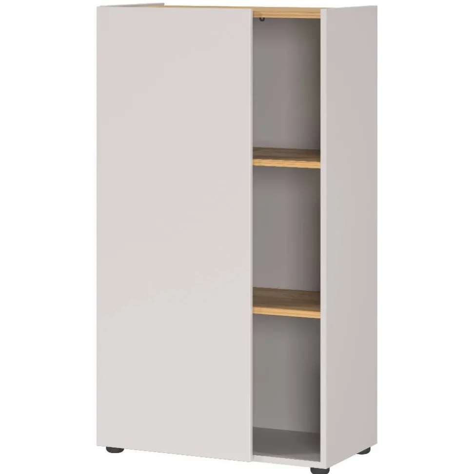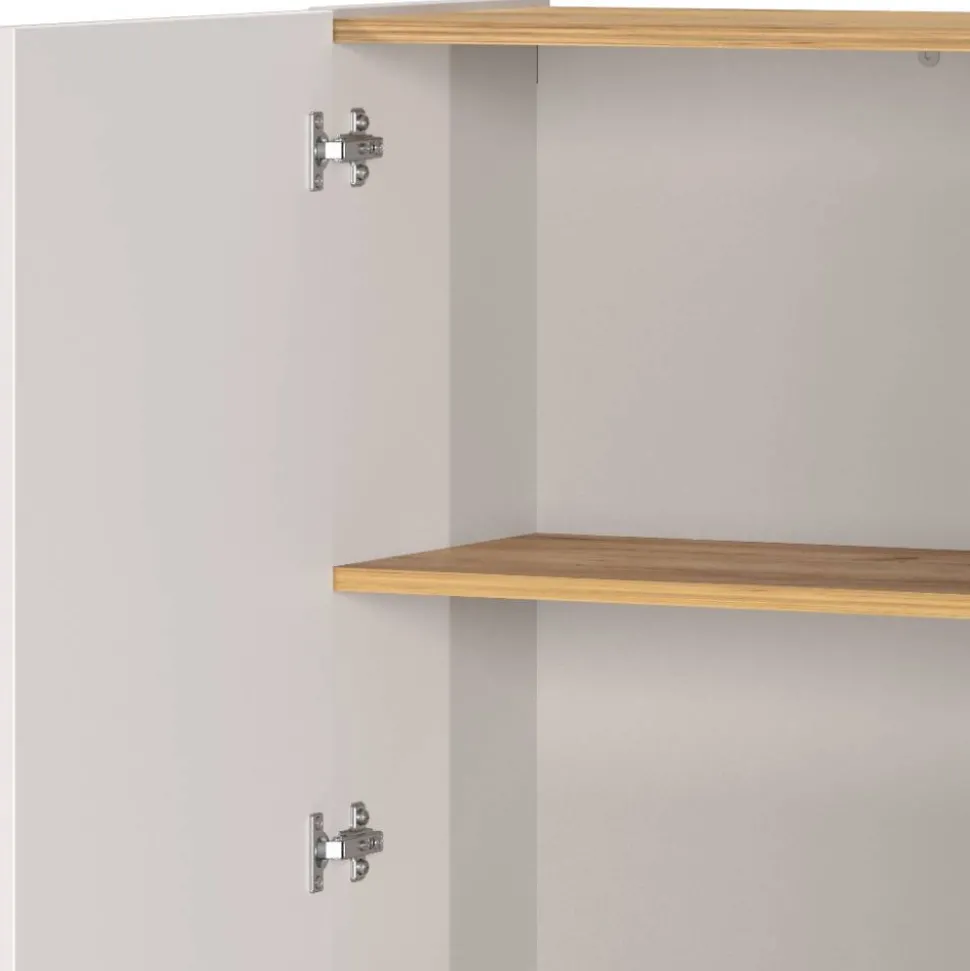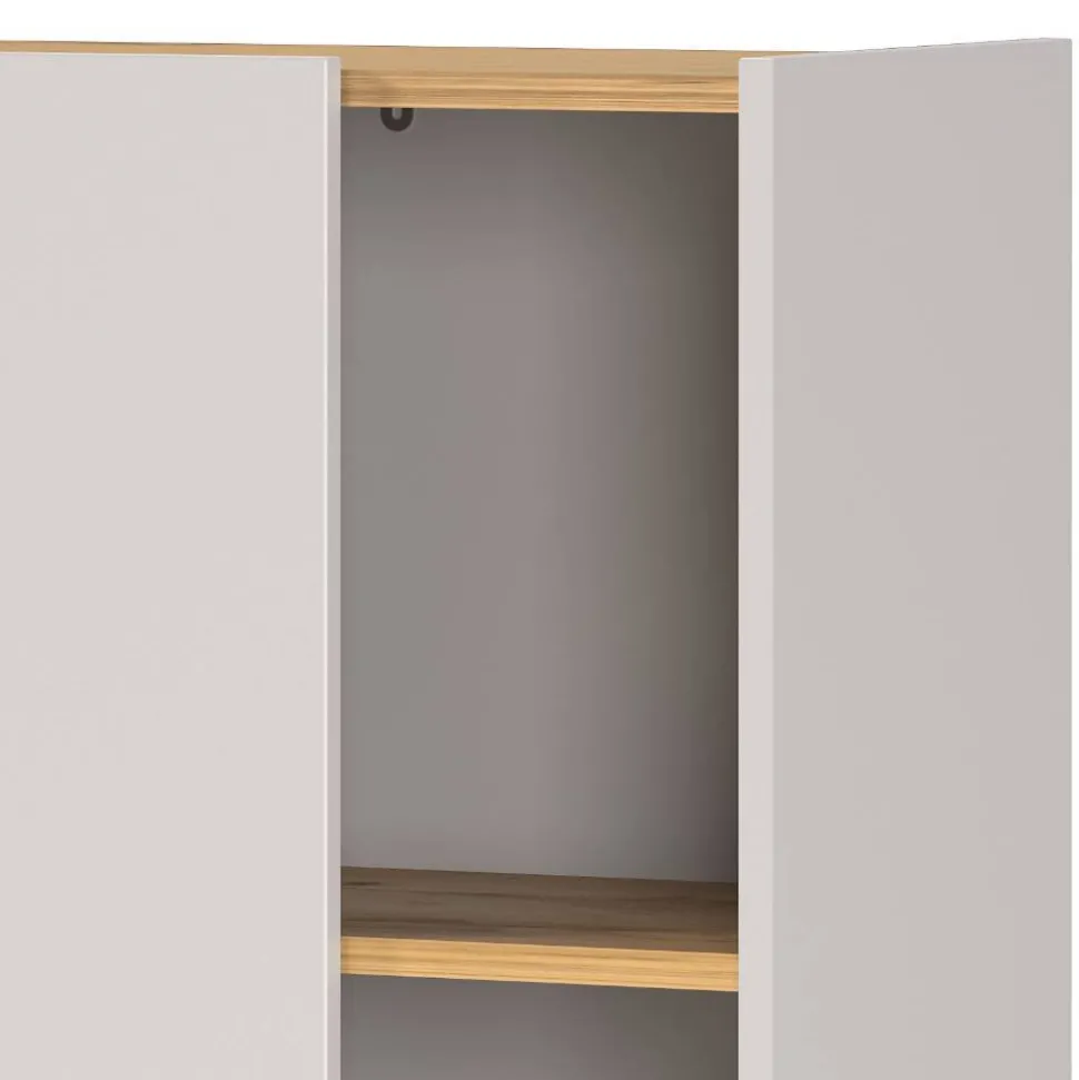 Dank des variablen Türanschlags – links oder rechts montierbar – lässt sich der Schrank problemlos an unterschiedliche Raumkonzepte anpassen. Die Kunststoff-Bodengleiter gewährleisten einen festen Stand und schützen empfindliche Böden. Für zusätzliche Sicherheit ist eine Kippsicherung zur Wandbefestigung im Lieferumfang enthalten.