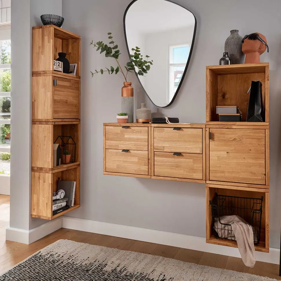Das Schrankwürfel Set „Iljona“ zeichnet sich durch sein modernes Design aus, das klare Linien mit einer natürlichen, lebhaften Holzmaserung kombiniert. Die natürlich geölten Oberflächen unterstreichen die Qualität und Schönheit des Holzes, während dezente Metallkantengriffe einen Hauch von Raffinesse hinzufügen. Das moderne Design passt sich nahtlos jeder Raumsituation an und sorgt für ein aufgeräumtes, aber stilvolles Ambiente.