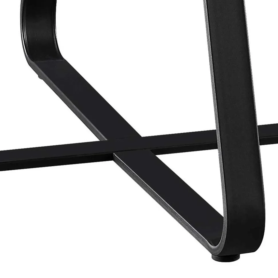 Getragen wird die Platte von einem standsicheren Bügelgestell aus Stahl, das ebenfalls pulverbeschichtet wurde. Die Maße der Bügel (ca. 6 x 1,5 cm) unterstreichen die robuste Bauweise, ohne dabei klobig zu wirken. Die gebogene Form sorgt für viel Beinfreiheit und ein luftiges, modernes Design, das sich mühelos in jede Wohnlandschaft einfügt.