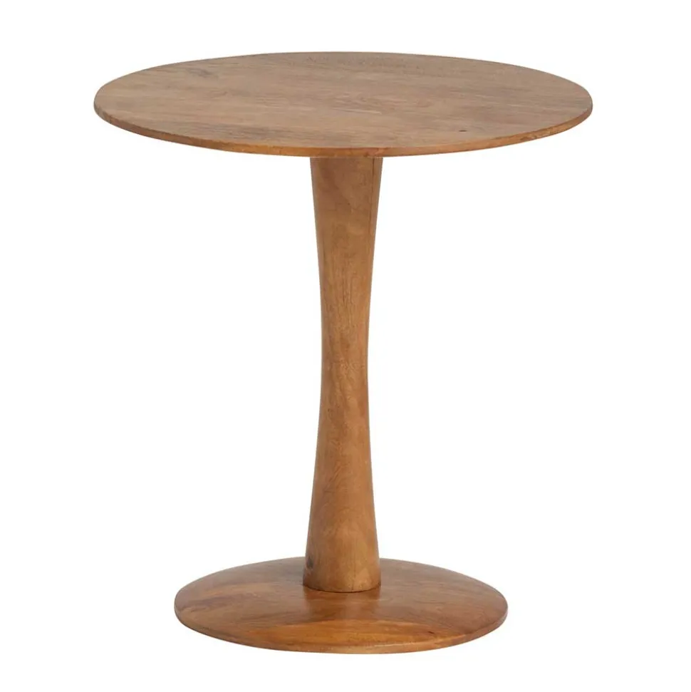 Die Oberflächen des Beistelltisches sind in einem edlen Cognacfarbton lackiert. Diese Lackierung betont die lebhafte Maserung des Mangoholzes und verleiht dem Tisch eine warme, einladende Optik. Gleichzeitig bietet sie einen optimalen Schutz vor Feuchtigkeit und Kratzern, sodass der Tisch auch nach Jahren noch wie neu aussieht.