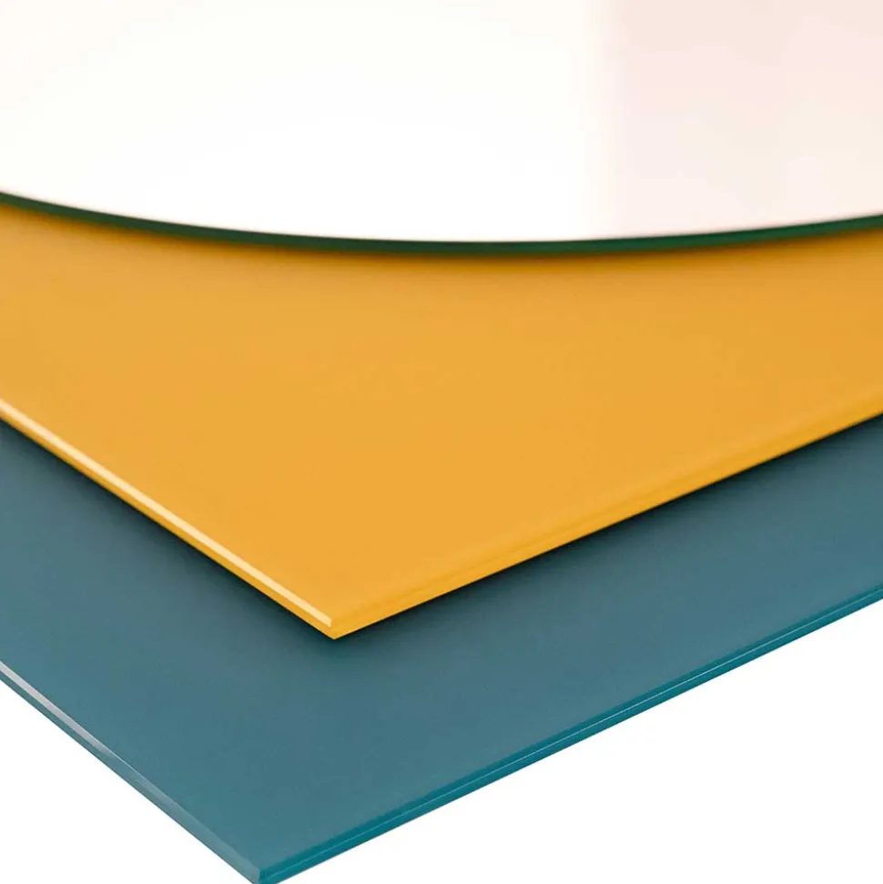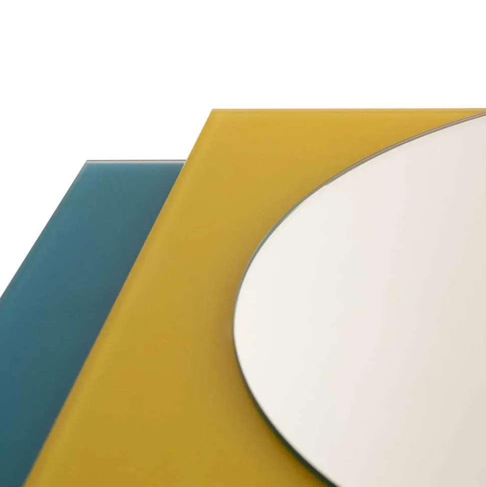 - Zwei versetzte Rechtecke aus Glas dienen als Rahmen für den runden Spiegel