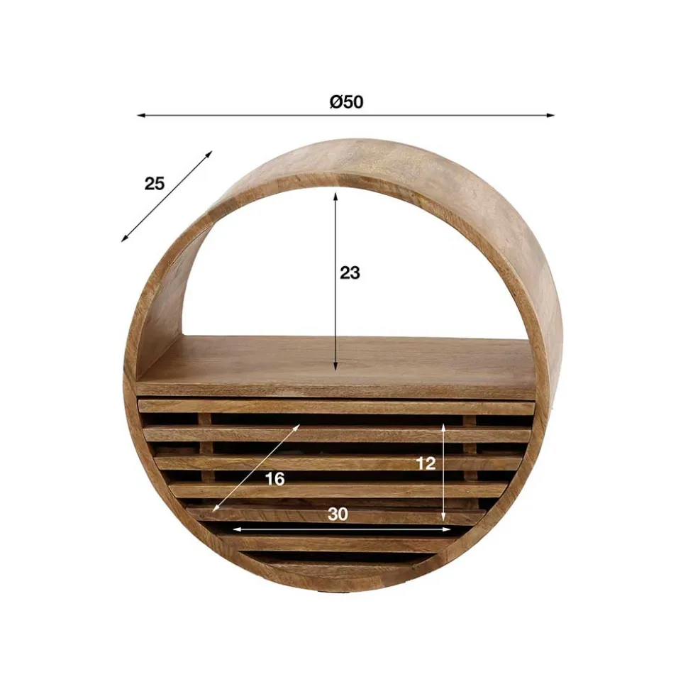 Das runde Wandregal „Detroit“ vereint außergewöhnliches Design mit einer warmen, natürlichen Farbgebung. Aus massivem Mangoholz gefertigt und in einer sanften Sandfarbe gehalten, strahlt es eine besondere Wärme und Behaglichkeit aus. Die geschmackvolle runde Formgebung verleiht dem Regal eine harmonische Optik und macht es zu einem echten Hingucker in jedem Raum. Ob im Wohnzimmer, Flur oder Büro – das Wandregal „Detroit“ bietet nicht nur praktischen Stauraum, sondern setzt Ihre liebsten Dekorationsgegenstände gekonnt in Szene.