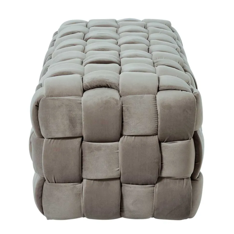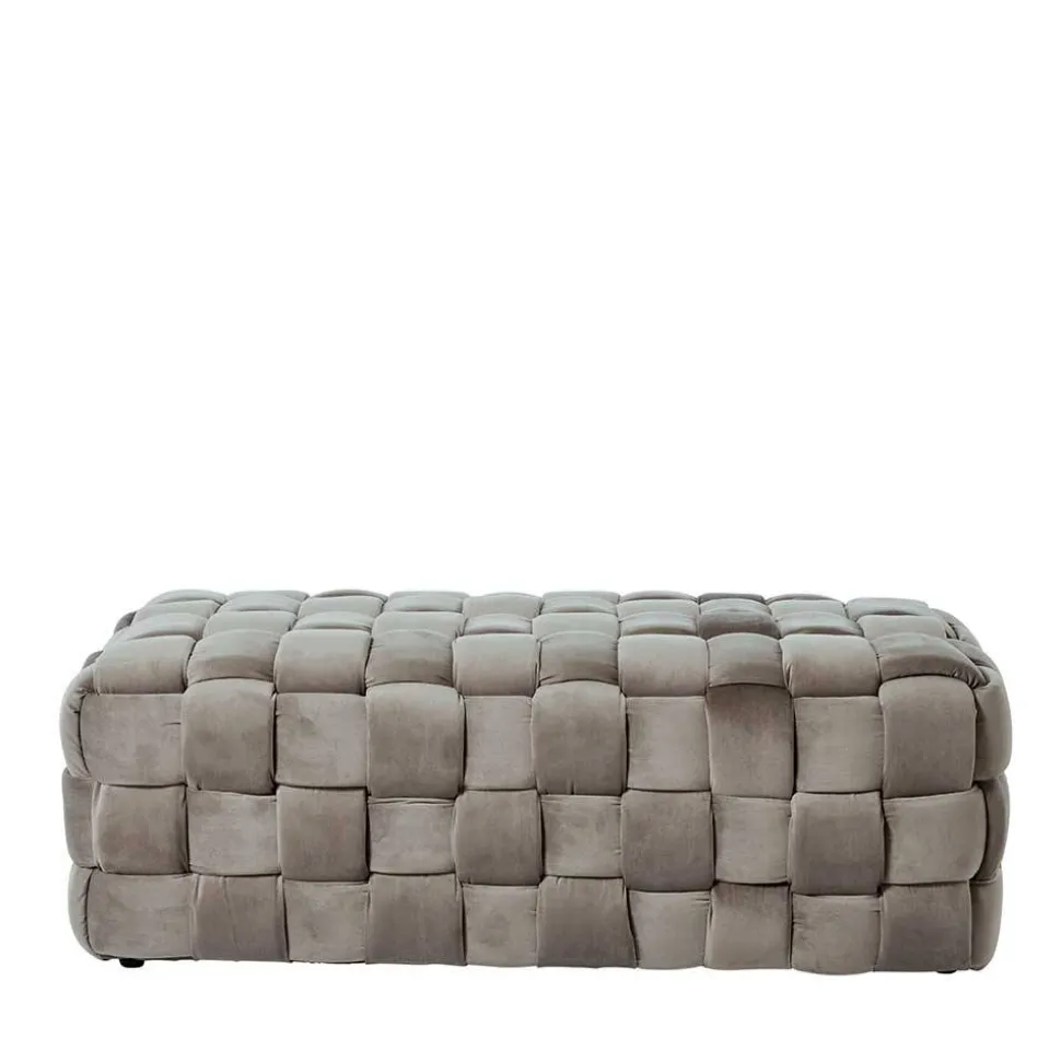 Sie suchen ein Möbelstück, das nicht nur funktional ist, sondern auch durch sein einzigartiges Design überzeugt? Dann ist die Samt-Polsterbank „Josch“ genau das Richtige für Sie! Der sanfte Taupe-Farbton in Kombination mit dem aufwendig gestalteten Flechtdesign macht diese Bank zu einem echten Hingucker. Egal, ob Sie sie im Wohnbereich, Flur oder Schlafzimmer platzieren – die „Josch“ fügt sich mühelos in jede Umgebung ein und bringt modernen Stil in Ihre vier Wände. Dank ihrer rechteckigen Form von 118 cm Länge, 50 cm Breite und 43 cm Höhe lässt sich die Bank sogar als kompakter Couchtisch-Ersatz oder Beistelltisch verwenden.