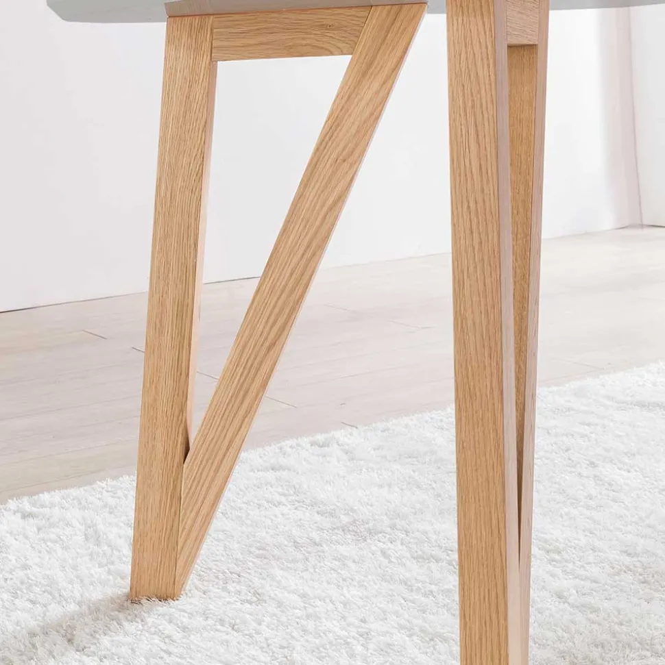 Formschön und durchdacht: Die Tischplatte besticht durch ihre solide Stärke und abgerundeten Kanten. Diese sanfte Kontur ist nicht nur ein optischer Vorteil – sie erhöht auch die Sicherheit, reduziert die Stoßgefahr und fühlt sich angenehm glatt an. Das dekorative Vierfußgestell aus massivem, geöltem Eichenholz gibt dem Tisch nicht nur Stabilität, sondern auch eine elegante, zeitlose Ausstrahlung.