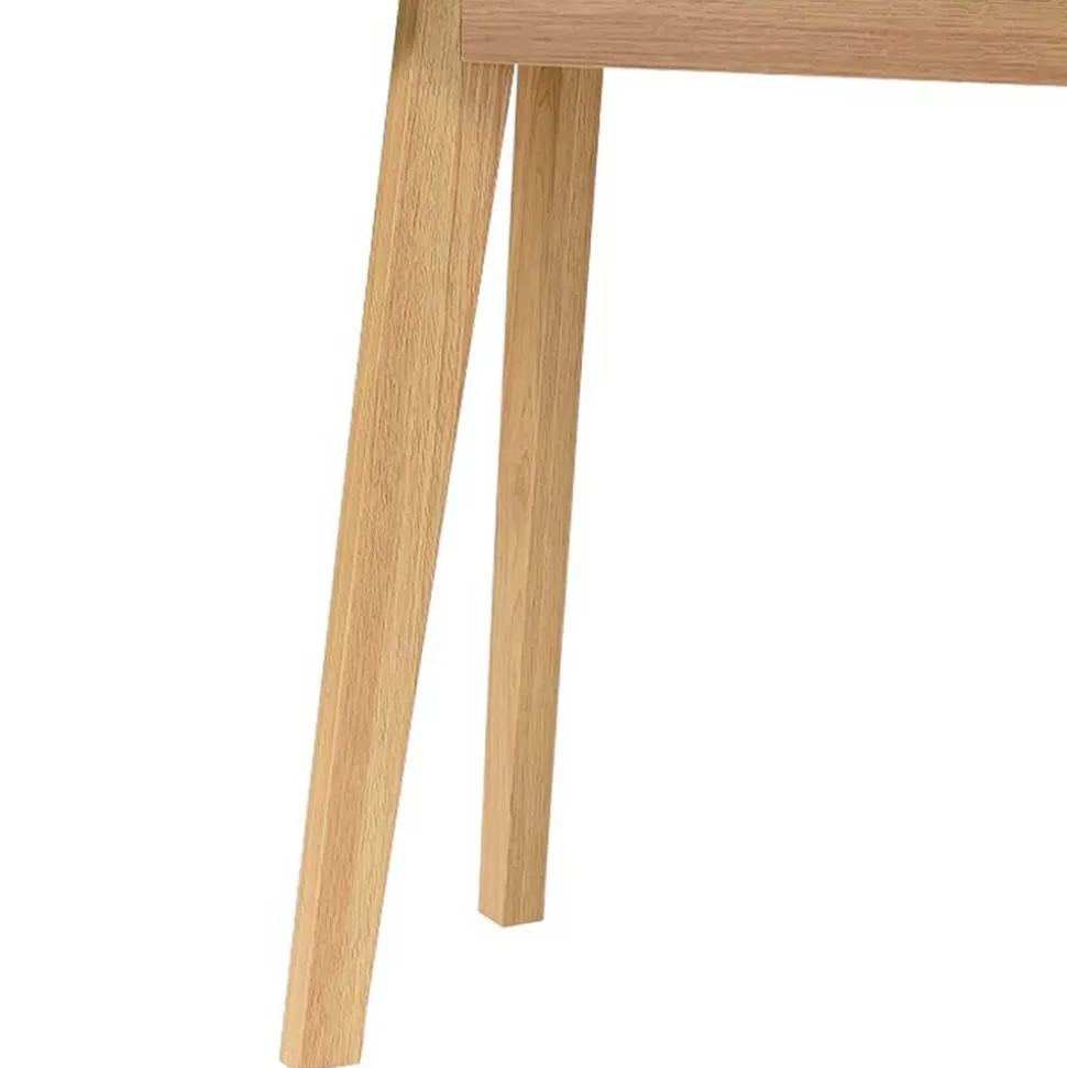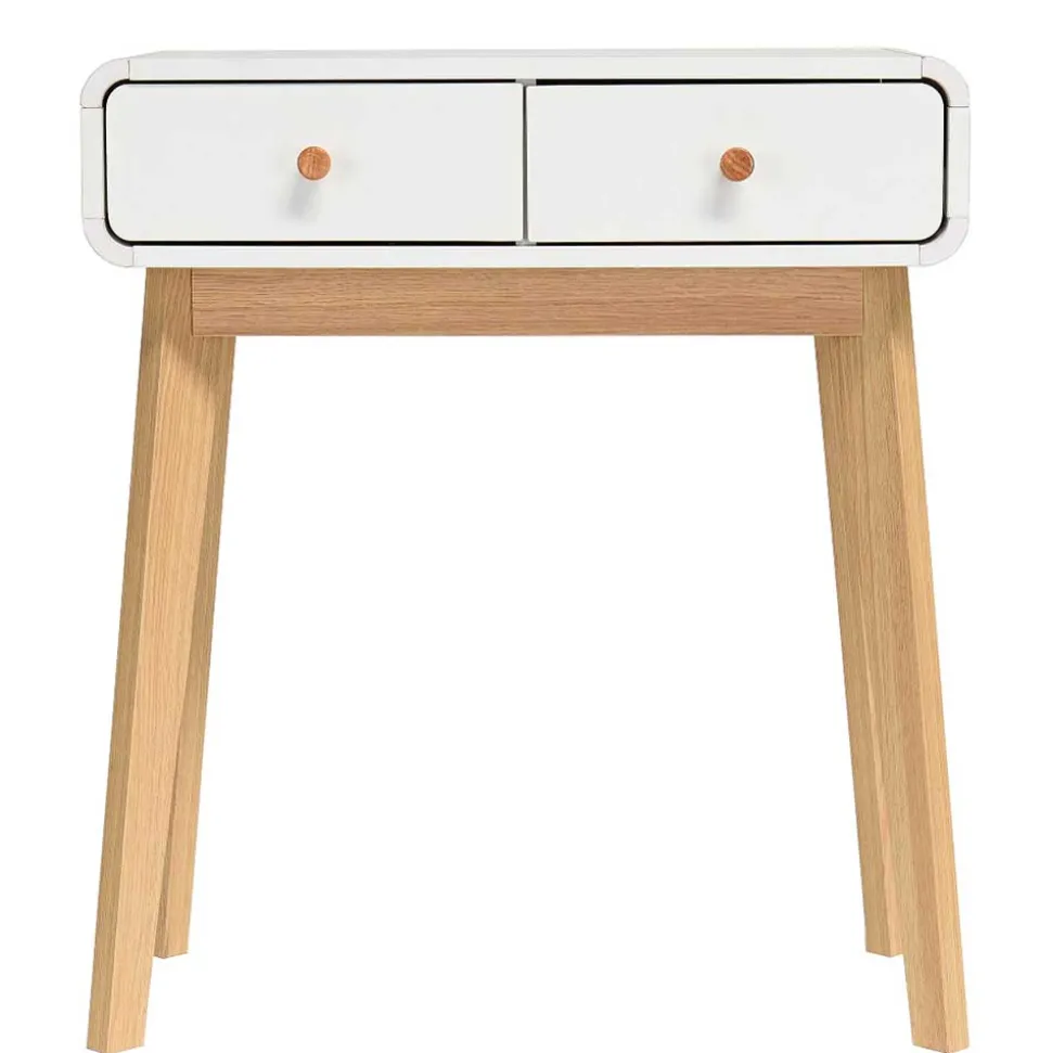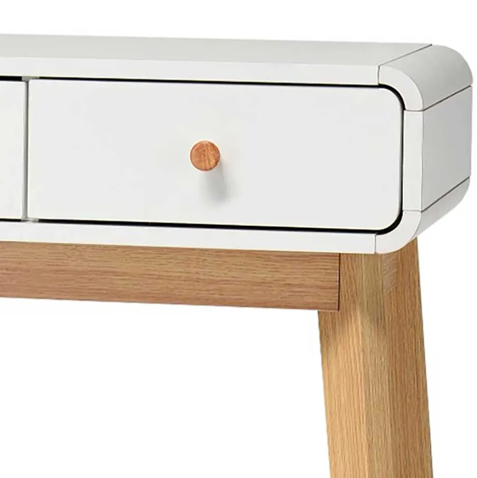 Dezent abgerundete Ecken verleihen dem Möbelstück eine sanfte Optik und sorgen für mehr Sicherheit – ideal auch für Haushalte mit Kindern. Die schräg gestellten Beine in Holzoptik-Eiche setzen einen warmen Kontrast zum strahlenden Weiß der Tischplatte und unterstreichen den skandinavischen Charme. Die runden Holz-Knopfgriffe fügen sich harmonisch ins Gesamtbild ein und sorgen für eine angenehme Haptik beim Öffnen der Schubladen.