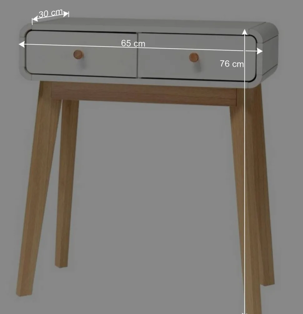 Ob als stilvolle Dielenkonsole für Schlüssel, Post und Deko oder als praktischer Schminktisch im Schlafzimmer – dieses Möbelstück überzeugt mit Flexibilität. Mit seinen kompakten Maßen von 65 cm Breite, 76 cm Höhe und 30 cm Tiefe passt der Tisch perfekt in kleine Räume und macht überall eine gute Figur. Die stabile Tischplatte bietet ausreichend Platz für Accessoires, während die zwei geräumigen Schubladen mit leichtgängigen Metallauszügen zusätzlichen Stauraum für alltägliche Dinge bereithalten.