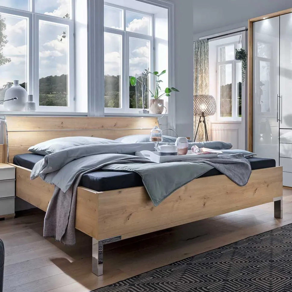 Das Set besticht durch kontraststarke Akzente, die für ein harmonisches Gesamtbild sorgen. Die Verbindung von Eiche Bianco und strahlendem Weiß schafft eine zeitlose Ästhetik, die in jedem Schlafzimmer für Aufsehen sorgt.