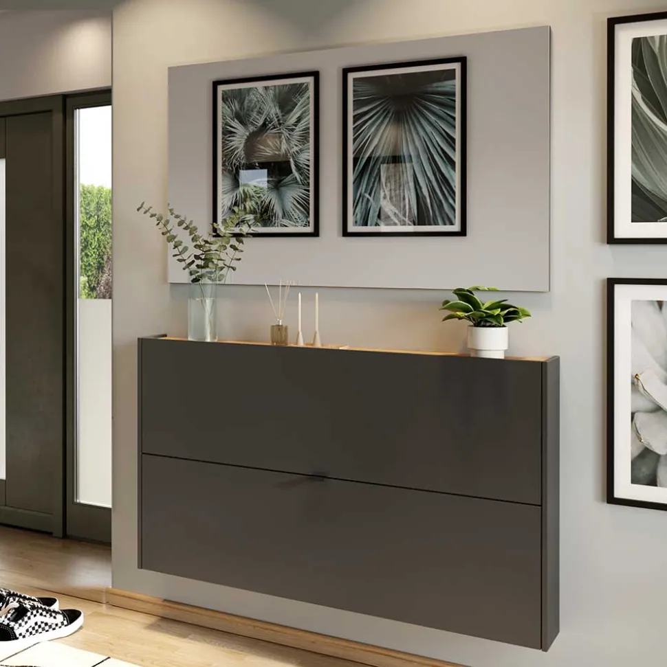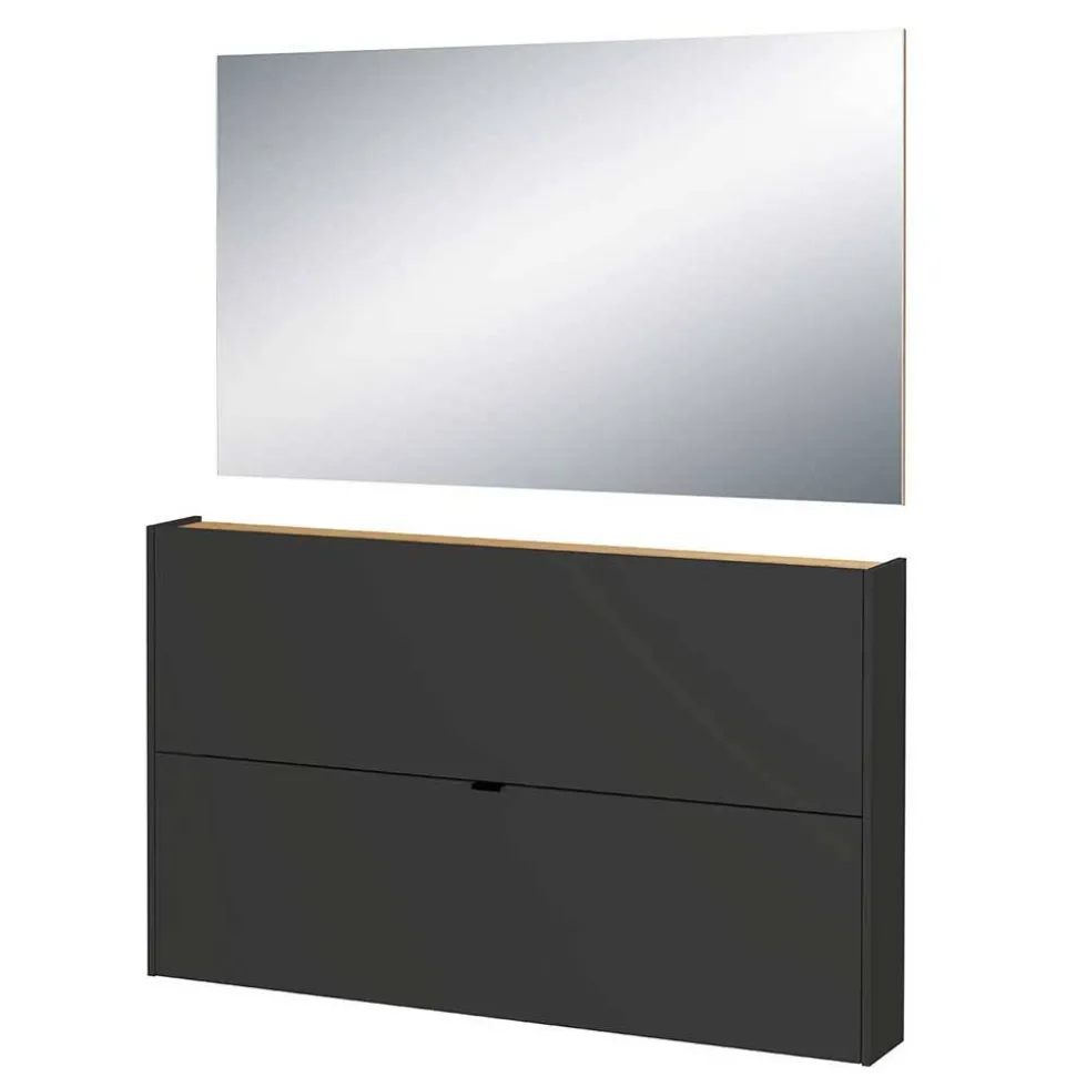Entdecken Sie das Schuhkommode und Spiegel Set „Sidgarus“, das Ihr Zuhause auf stilvolle Weise bereichert. Mit seiner geradlinigen, minimalistischen Gestaltung fügt sich dieses zweiteilige Set perfekt in jeden Raum ein und strahlt einen charmanten skandinavischen Wohnstil aus. Die harmonische Farbgebung aus Dunkelgrau und dem natürlichen Holzdekor der Wildeiche sorgt für eine warme und einladende Atmosphäre.