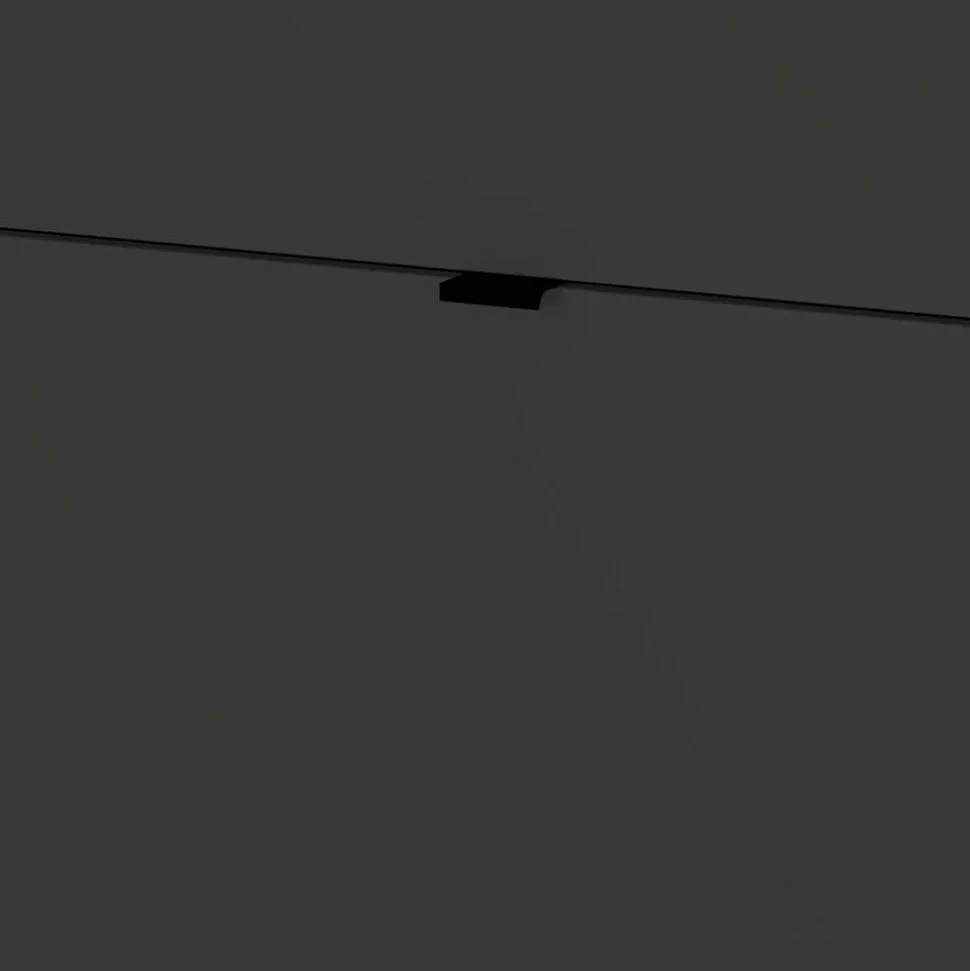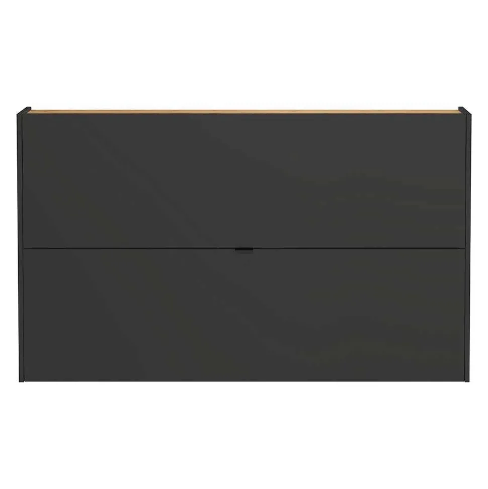 Die großflächigen Fronten der Schuhkommode sind ohne aufgesetzte Griffe gestaltet, wodurch die Optik besonders clean und modern wirkt. Ein dezenter Kantengriff aus pulverbeschichtetem Metall in Schwarz erleichtert das Öffnen der unteren Klappe. Die Deckplatte in Wildeiche Natur Holzdekor wird durch leicht erhöhte Korpuskanten und die überstehende Klappenfront perfekt eingefasst. Hier findet sich Platz für Ihre schönsten Dekorationselemente, kleine Zimmerpflanzen oder praktische Ablagen für Schlüssel und Geldbörse.