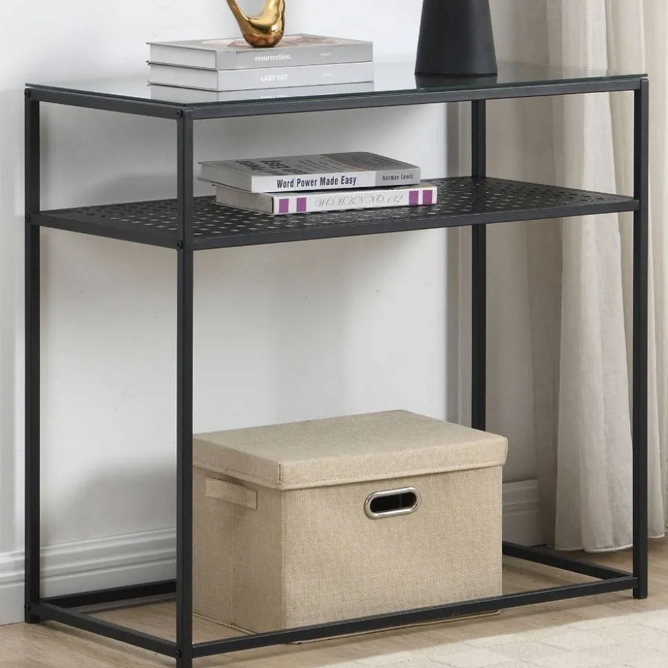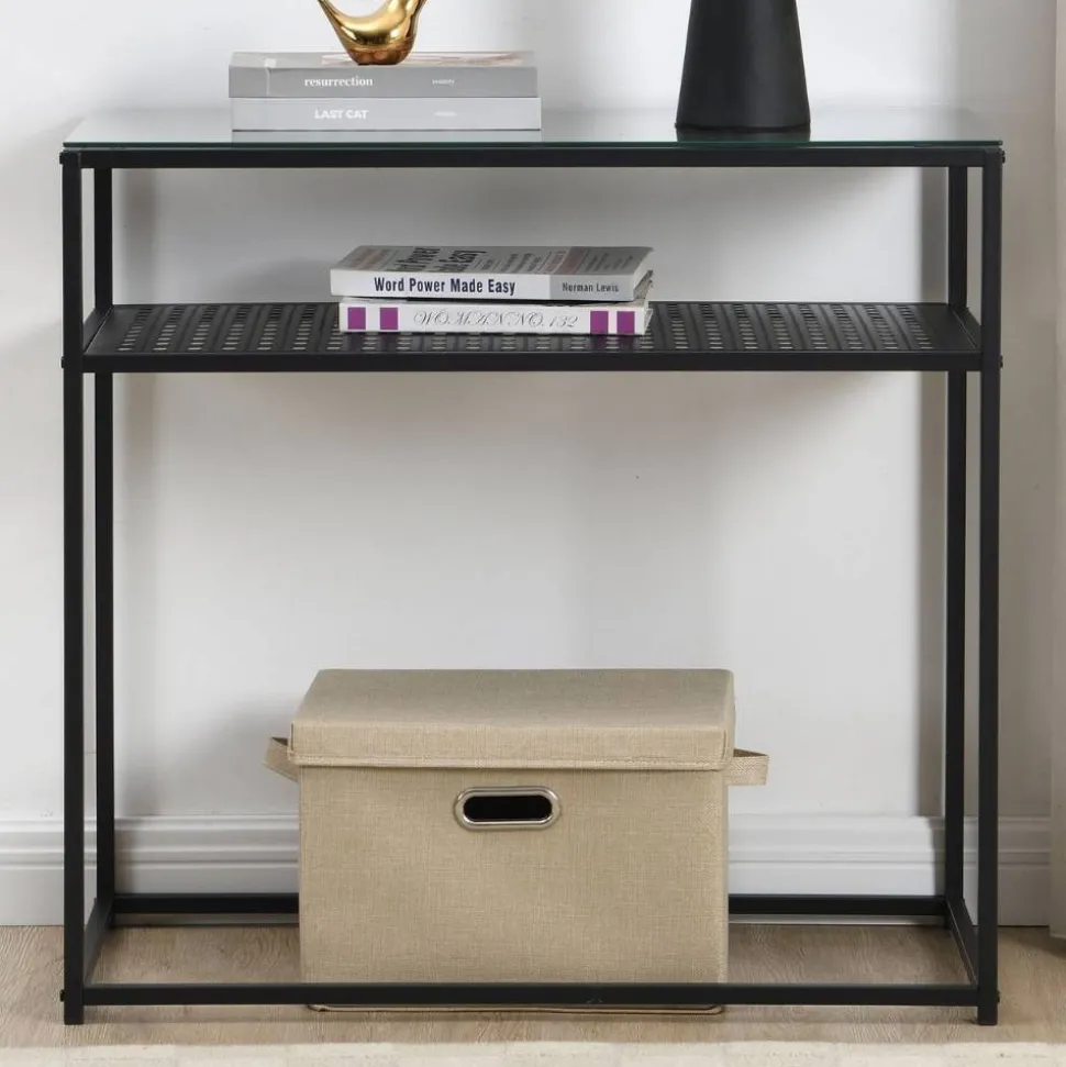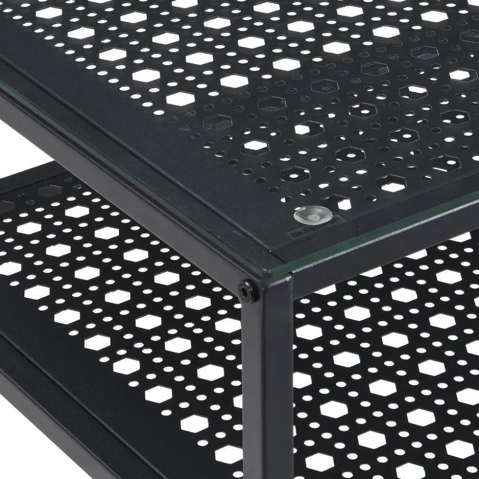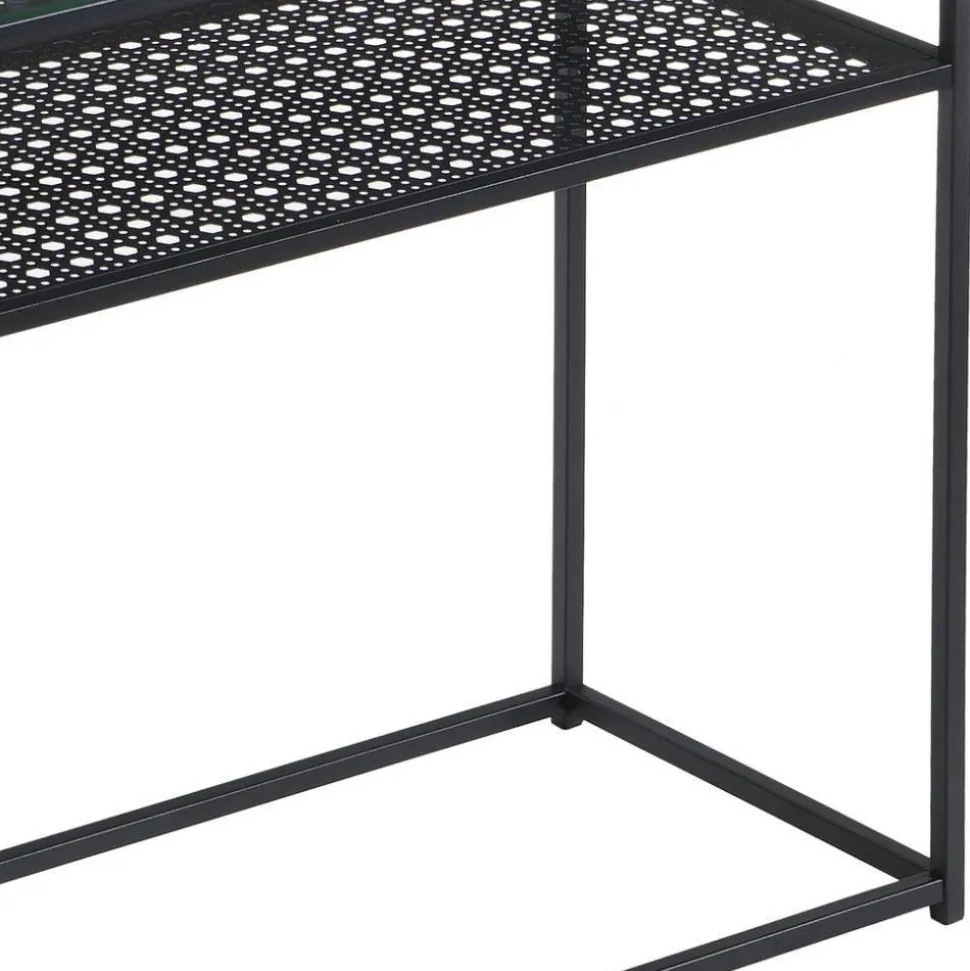 Gefertigt aus robustem Metall und klarem Sicherheitsglas, verkörpert der Konsolentisch „Panfreda“ Langlebigkeit und Stabilität in harmonischem Zusammenspiel. Die schwarzen Metallflächen sind lackiert und dadurch besonders pflegeleicht. Zwei Ablageflächen aus fein gelochten Metallplatten setzen dabei raffinierte Akzente: Kleine runde und größere sechseckige Öffnungen bilden ein spannendes, grafisches Muster, das an industrielle Gitterstrukturen erinnert. Auf der oberen Ebene liegt eine transparente Platte aus Sicherheitsglas – sie sorgt für Leichtigkeit im Design und lässt die Struktur darunter elegant durchscheinen.