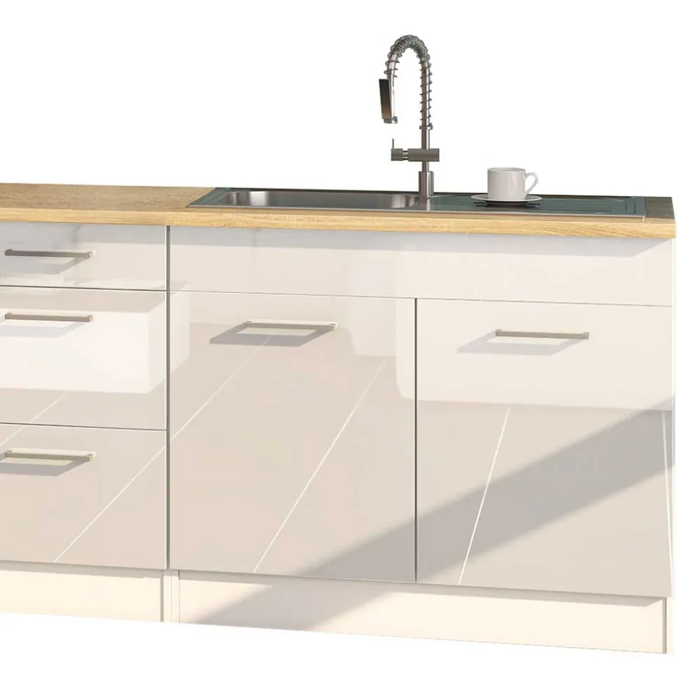 Die Fronten der Küchenzeile bestehen aus hochwertigem MDF (Mitteldichte Holzfaserplatte), das bekannt ist für seine Widerstandsfähigkeit und Umweltfreundlichkeit. MDF ist nicht nur robust, sondern auch besonders formstabil – perfekt für den täglichen Gebrauch in der Küche. Die Fronten sind in einem ansprechenden Weiß Hochglanz foliert. Dieses Verfahren sorgt nicht nur für eine glänzende Optik, sondern macht die Oberfläche besonders pflegeleicht und resistent gegen Feuchtigkeit und Kratzer.