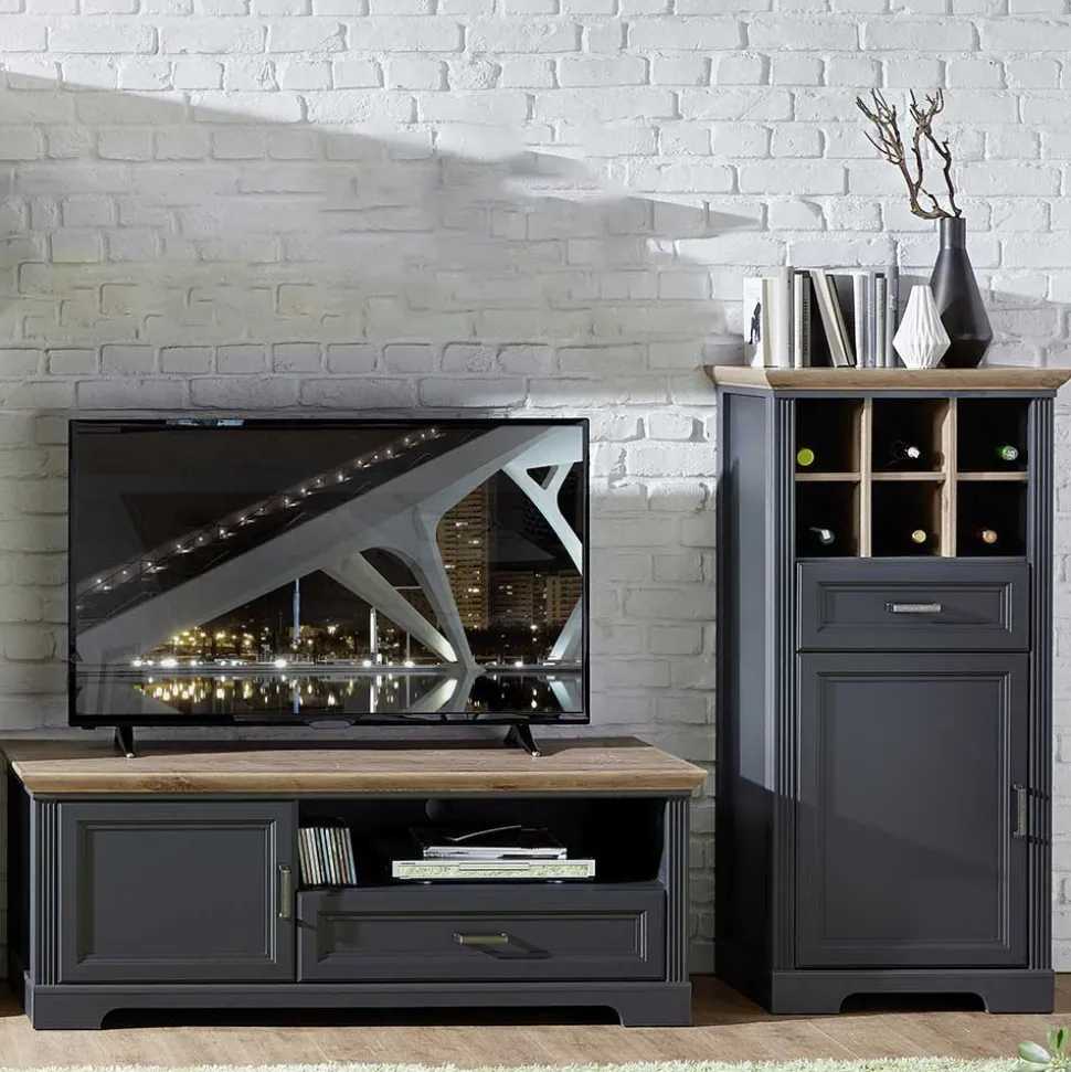 - Trendige Wohnwand in Dunkelgrau und Eichefarben