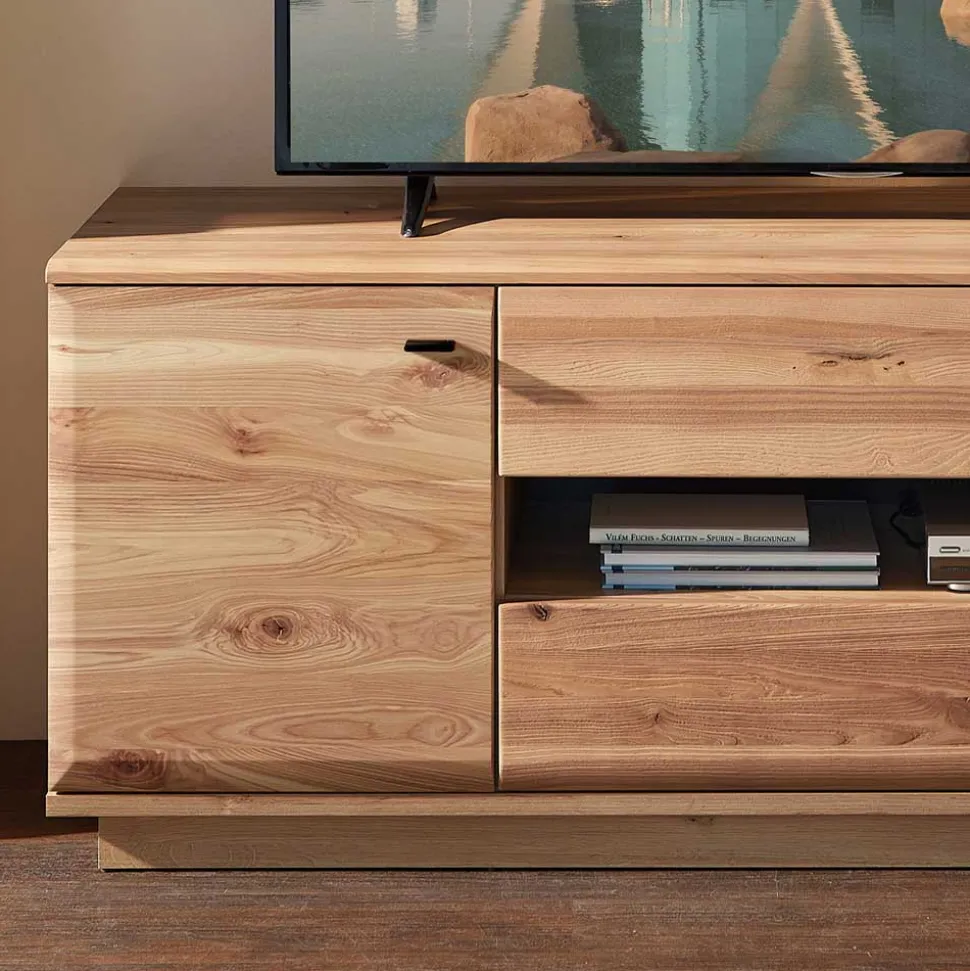 Die Fronten der Wohnwand „Cassna“ bestehen aus massivem Eschenholz, das für seine Widerstandsfähigkeit und seine edle Optik bekannt ist. Eschenholz bietet nicht nur eine langlebige und robuste Oberfläche, sondern auch eine natürliche Schönheit, die jedes Stück einzigartig macht. Der Korpus besteht aus MDF, das mit einer Folierung in Holzoptik Wildeiche veredelt wurde. Dieses Verfahren sorgt für eine realistische Holzstruktur und erhöht die Widerstandsfähigkeit des MDF gegenüber Feuchtigkeit und Kratzern. Die durchgehenden Lamellen der Fronten heben sich hervor und tragen zur optischen Harmonie bei, indem sie eine gleichmäßige und elegante Holzoberfläche bieten.