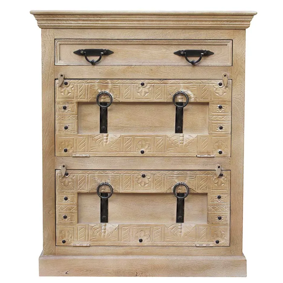 Nicht nur ästhetisch ansprechend, sondern auch äußerst praktisch im Eingangsbereich – der Schuhschrank „Abid“ bietet die ideale Lösung, um Ihre Schuhe stilvoll zu verstauen. Die Front des Schrankes ist mit einer dekorativen Reliefstruktur und antik wirkenden Metallbeschlägen verziert, die für einen zusätzlichen Blickfang sorgen.